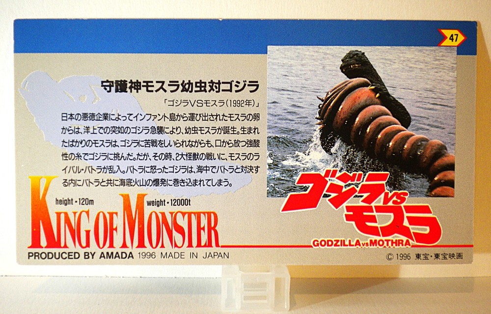 AMADA 1996 - GODZILLA KING OF THE MONSTER - WIDE COLLECTION - TRADING CARD 47 - GODZILLA 1992 & MOTHRA LARVA 1992 - NEW I purchased a new, unopened box of this that had individual packs in it. I made a complete set and placed them in a trading card folder. This is an extra one that has been in deep storage for decades. The trading card 47, Godzilla 1992 with Mothra Larva 1992 measures approximately 4 5/8 L x 2 1/2 W. I am not a professional trading card collector appraiser. I opened a pack of trading cards; this specimen was removed and placed in storage. It is new, in "very good condition" to "near mint condition." See the photo from the listing to make your determination on condition. This is an original vintage trading card collectible that is approximately 29 years old, rare, and so hard to buy in the same condition as the one listed here! All my inventory and stock are authorized and licensed by various companies in Japan and here domestically and have been maintained in the very best condition possible over the years and, or decades. Please take a moment to read this before you place a bid or make a purchase from me. I use as much time as needed to check, double-check, and triple-check every listing that I place on eBay, however, I do make mistakes in my listings now and then. I do, and when brought to my attention, will always correct any mistake in my listing. I would ask you to please be familiar with or know about the item that you will place a bid on or purchase from me. If you need additional information, or if you have any concerns or questions about the listing, please contact me before you place any bid or before you purchase the item from me. If this is a gift for someone, please know that if this is not the item they would like to receive, I offer no exchanges or returns, all sales are final. If a bid was won or if a purchase was made, the completion of the payment is expected. It is out of my control and not my responsibility if a most beloved family pet inadvertently placed a bid or made a purchase accidentally or not on a computer or smartphone without the eBay account holder knowing. The transaction will not be canceled by me! Please take a moment to learn something about me, I am an eBay seller who tries his very best to offer all my customers the very best, best-conditioned collectibles that the world has to offer along with the very best customer service that I can provide. I want every customer of mine to know that I am not your "average seller on eBay," I operate a very small and personalized "pop operation" that caters to his customers. It has blessed me and brought me great joy to have so many grandmothers, mothers, and dads buy from me for their loved ones. Sometimes, I do not have the lowest price for a collectible item on eBay (sometimes I do) , but many of my customers who know this and still purchase from me will share with you that "the overall purchasing experience was well worth the price." I invite and welcome everyone to be a customer of mine. Having honesty and integrity with every customer of mine are not just empty words, they are a practice for me that has been confirmed with the various feedback that has been left for me over the many years of selling on eBay!