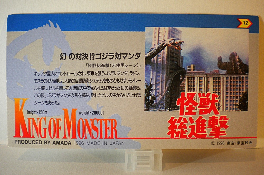 AMADA 1996 - GODZILLA KING OF THE MONSTER - WIDE COLLECTION - TRADING CARD 72 - GODZILLA 1968 WITH MANDA 1968 - NEW I purchased a new, unopened box of this that had individual packs in it. I made a complete set and placed them in a trading card folder. This is an extra one that has been in deep storage for decades. The trading card 72, Godzilla 1968 with Manda 1968 measures approximately 4 5/8 L x 2 1/2 W. I am not a professional trading card collector appraiser. I opened a pack of trading cards; this specimen was removed and placed in storage. It is new and in "very good" to "near mint condition" (see photo). This is an original vintage trading card collectible that is approximately 29 years old, rare, and so hard to buy in the same condition as the one listed here! All my inventory and stock are authorized and licensed by various companies in Japan and here domestically and have been maintained in the very best condition possible over the years and, or decades. Please take a moment to read this before you place a bid or make a purchase from me. I use as much time as needed to check, double-check, and triple-check every listing that I place on eBay, however, I do make mistakes in my listings now and then. I do, and when brought to my attention, will always correct any mistake in my listing. I would ask you to please be familiar with or know about the item that you will place a bid on or purchase from me. If you need additional information, or if you have any concerns or questions about the listing, please contact me before you place any bid or before you purchase the item from me. If this is a gift for someone, please know that if this is not the item they would like to receive, I offer no exchanges or returns, all sales are final. If a bid was won or if a purchase was made, the completion of the payment is expected. It is out of my control and not my responsibility if a most beloved family pet inadvertently placed a bid or made a purchase accidentally or not on a computer or smartphone without the eBay account holder knowing. The transaction will not be canceled by me! Please take a moment to learn something about me, I am an eBay seller who tries his very best to offer all my customers the very best, best-conditioned collectibles that the world has to offer along with the very best customer service that I can provide. I want every customer of mine to know that I am not your "average seller on eBay," I operate a very small and personalized "pop operation" that caters to his customers. It has blessed me and brought me great joy to have so many grandmothers, mothers, and dads buy from me for their loved ones. Sometimes, I do not have the lowest price for a collectible item on eBay (sometimes I do) , but many of my customers who know this and still purchase from me will share with you that "the overall purchasing experience was well worth the price." I invite and welcome everyone to be a customer of mine. Having honesty and integrity with every customer of mine are not just empty words, they are a practice for me that has been confirmed with the various feedback that has been left for me over the many years of selling on eBay!