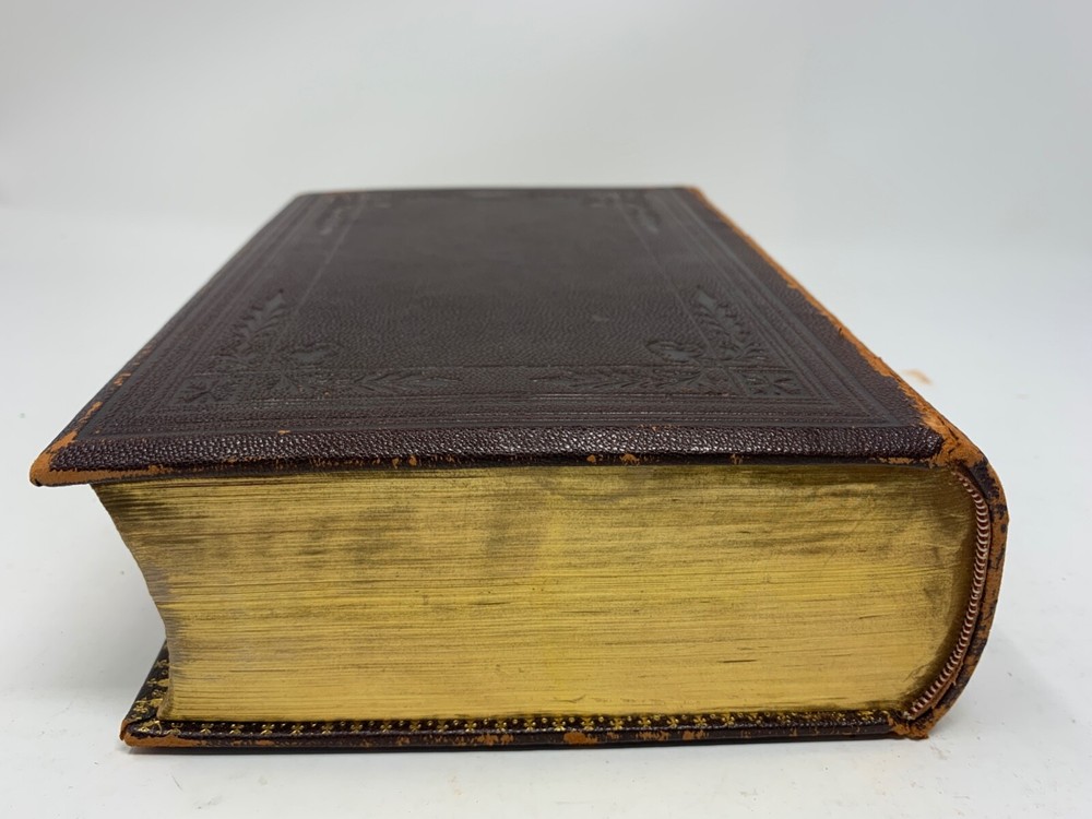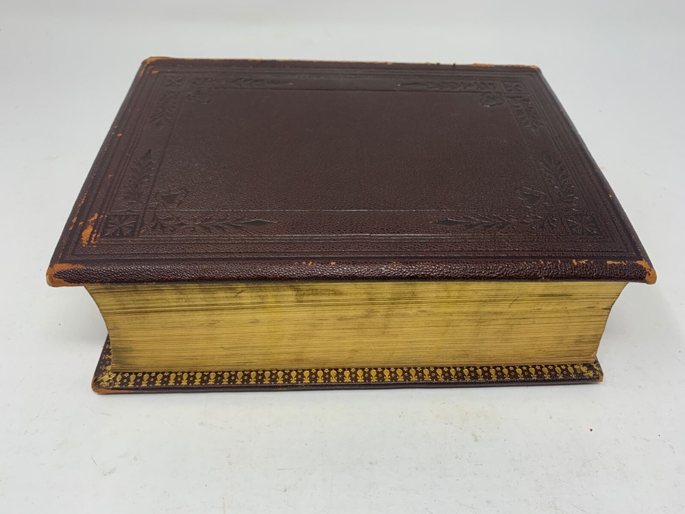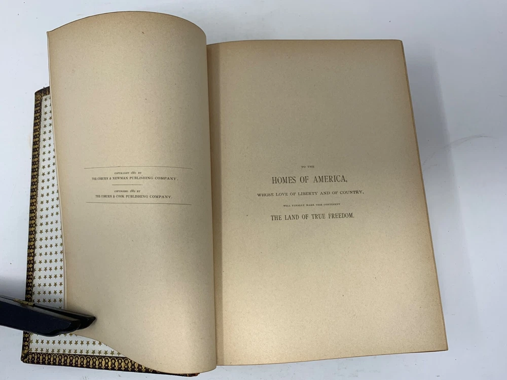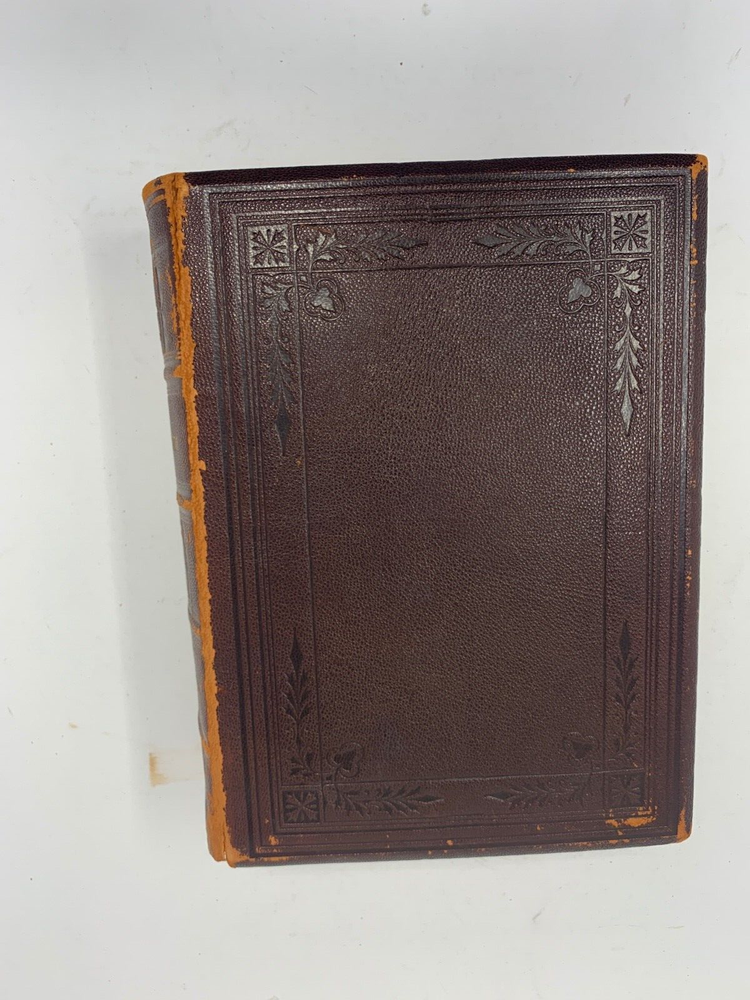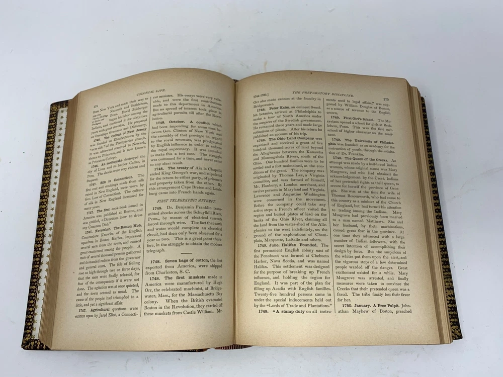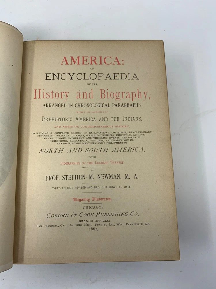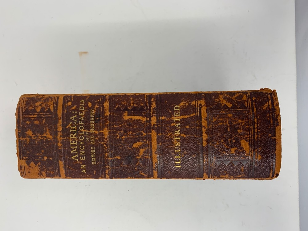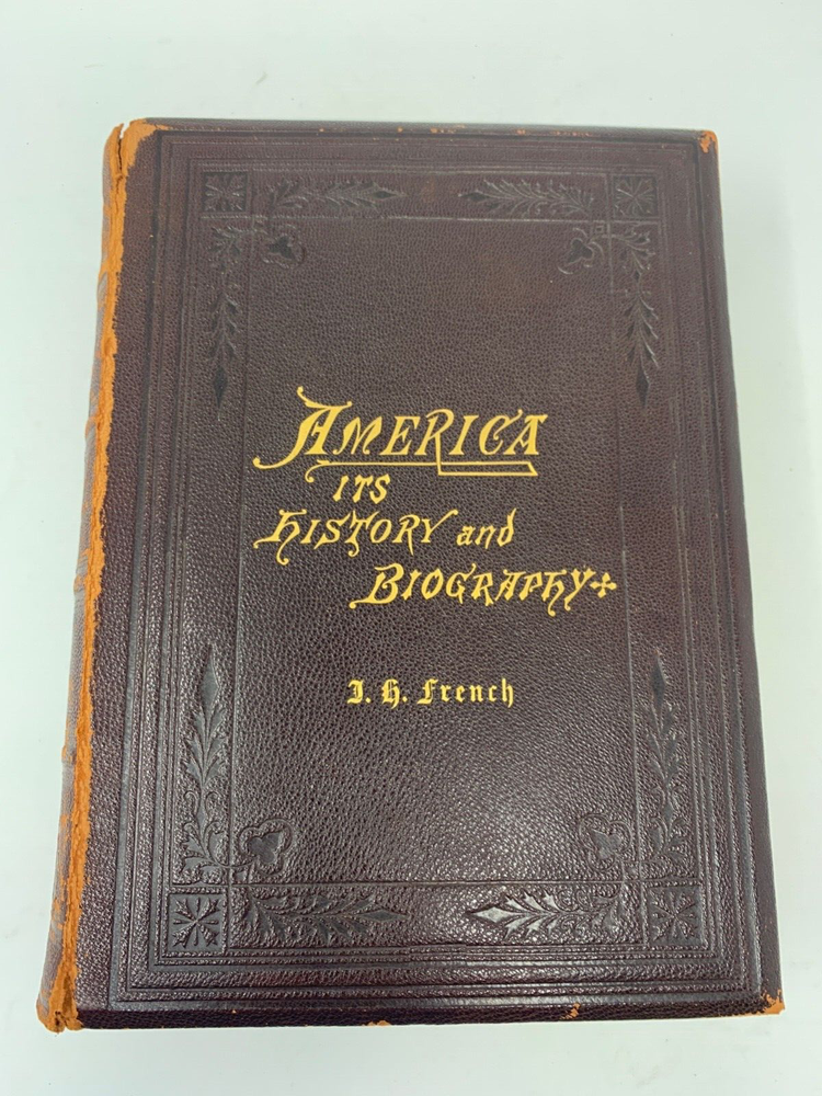 America: An Encyclopedia of Its History & Biography Arranged in Chronological Paragraphs. by Prof. Stephen M. Newman M.A. 3rd Ed. revised and brought down to date. 1882. I think it is leather bound with gold gilt on the cover for the title and owner of the book. The owner may have the initials T.H. or H.J. or J. H. and the last name French. Looking on the internet the book may have belonged in the prominent Cincinnati family of French and may have been a gift to J. H. French (1828-1903) , most likely from his son, Herbert Greer French, a P & G executive. This is all speculation on my part. Gold gilt on the pages. 1069 pages which includes the index. The book in inches is 3 X 8 X 10 . Weight is 5# 6 oz. Shipping will be with eBay media mail and I am able to ship multiple items. I am not a book dealer. The condition with the spine is the major issue with the book. Please see the photos and carefully consider this purchase. Please use 3X9X12 for the boxed size and 5 pounds 13 oz for the weight for shipping.