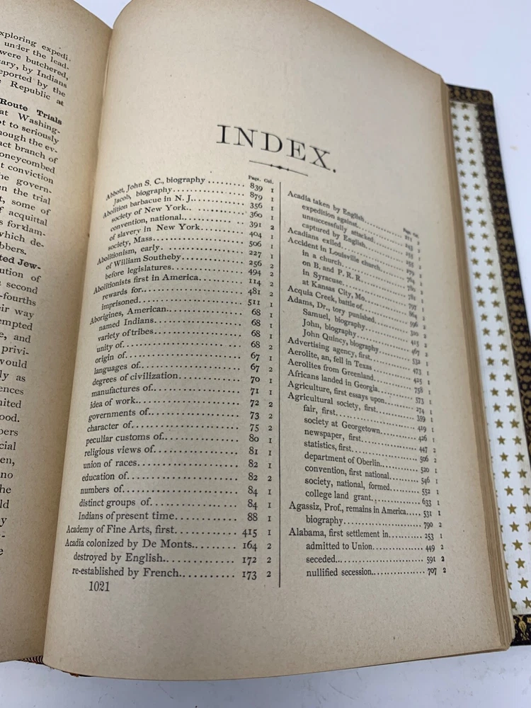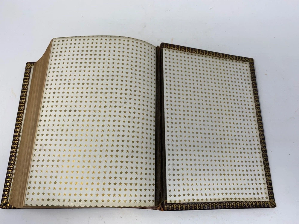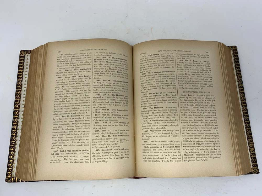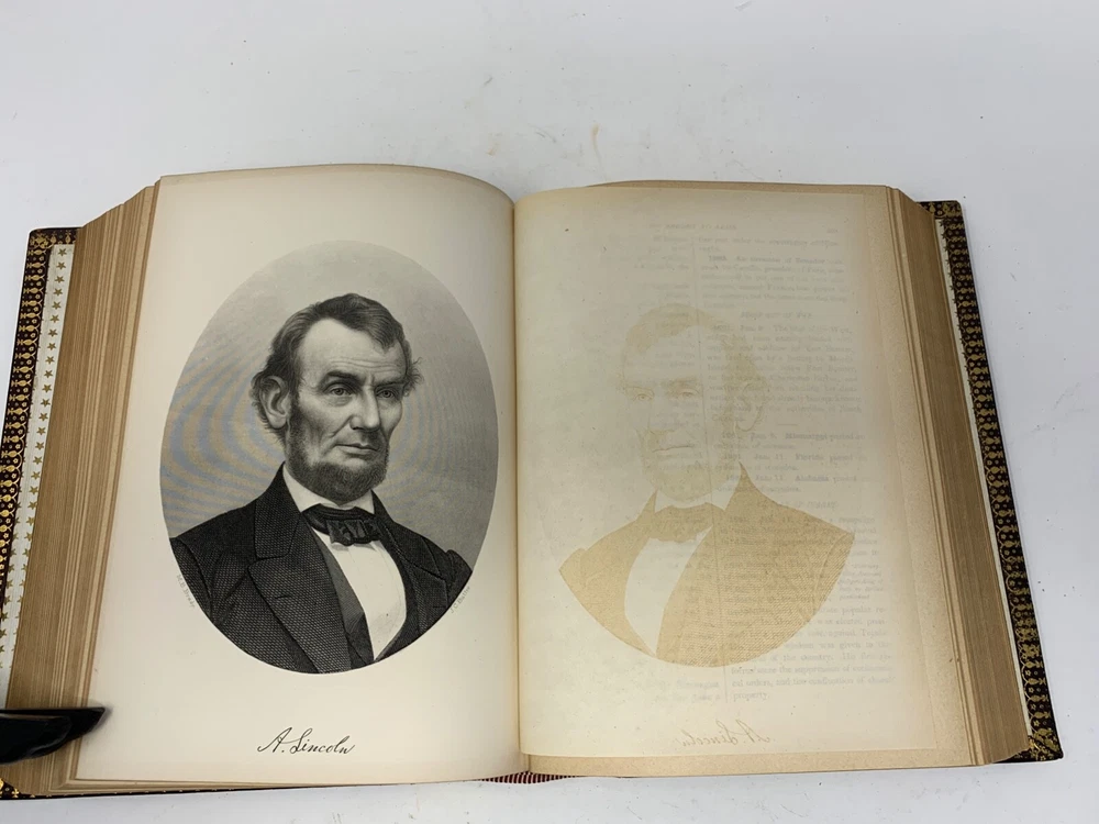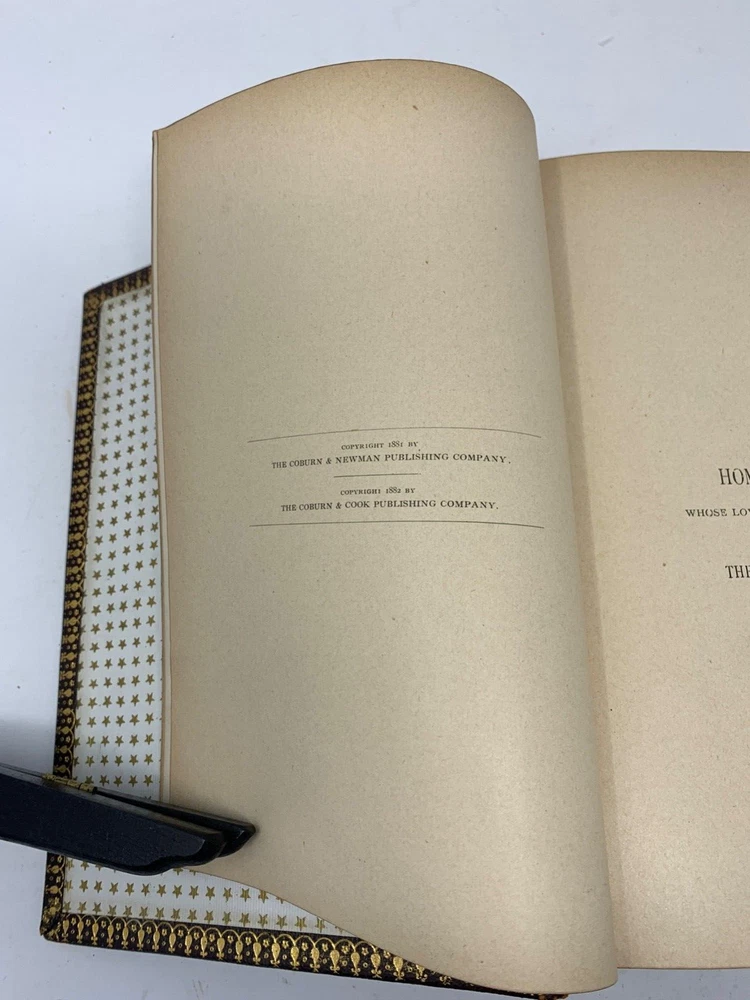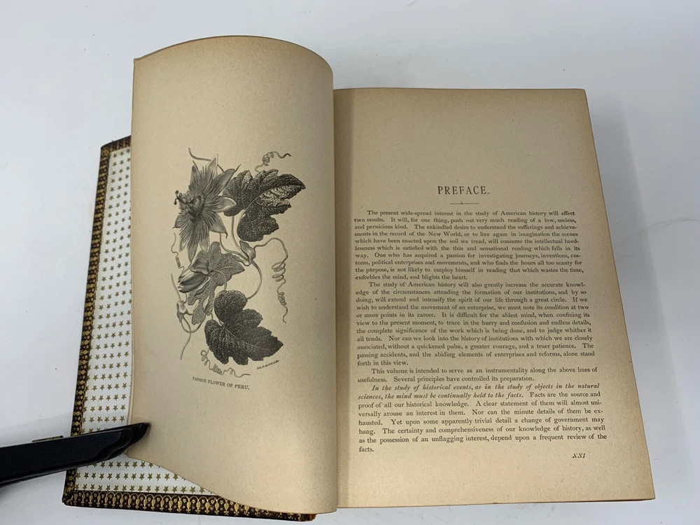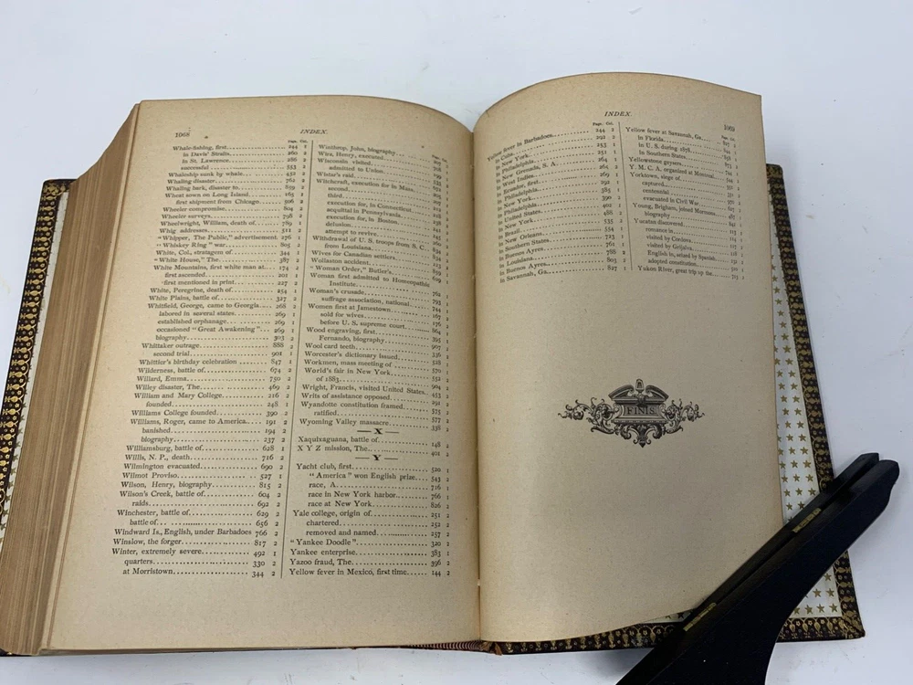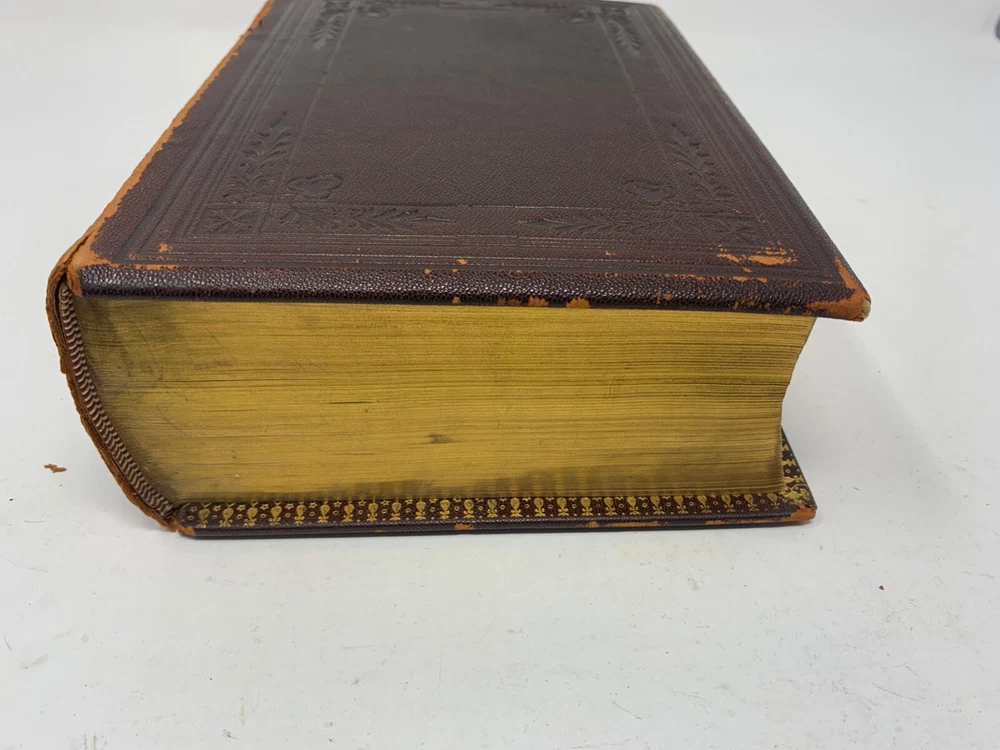 America: An Encyclopedia of Its History & Biography Arranged in Chronological Paragraphs. by Prof. Stephen M. Newman M.A. 3rd Ed. revised and brought down to date. 1882. I think it is leather bound with gold gilt on the cover for the title and owner of the book. The owner may have the initials T.H. or H.J. or J. H. and the last name French. Looking on the internet the book may have belonged in the prominent Cincinnati family of French and may have been a gift to J. H. French (1828-1903) , most likely from his son, Herbert Greer French, a P & G executive. This is all speculation on my part. Gold gilt on the pages. 1069 pages which includes the index. The book in inches is 3 X 8 X 10 . Weight is 5# 6 oz. Shipping will be with eBay media mail and I am able to ship multiple items. I am not a book dealer. The condition with the spine is the major issue with the book. Please see the photos and carefully consider this purchase. Please use 3X9X12 for the boxed size and 5 pounds 13 oz for the weight for shipping.