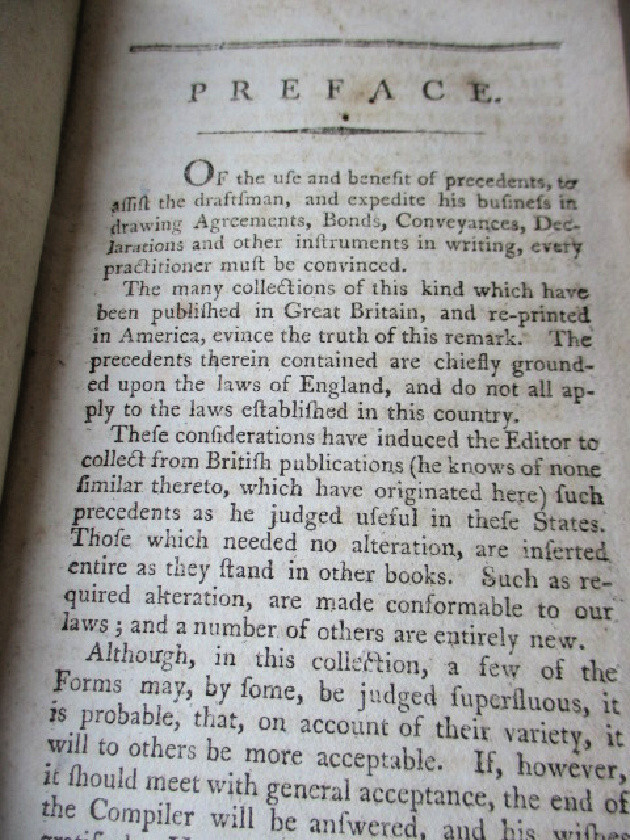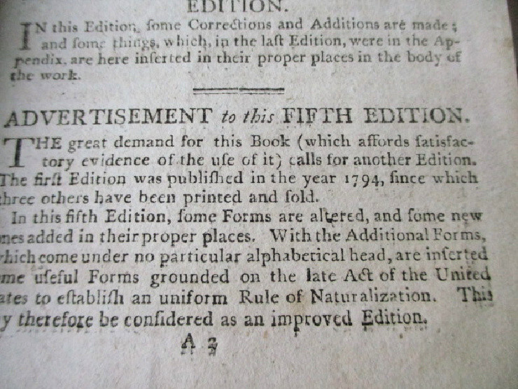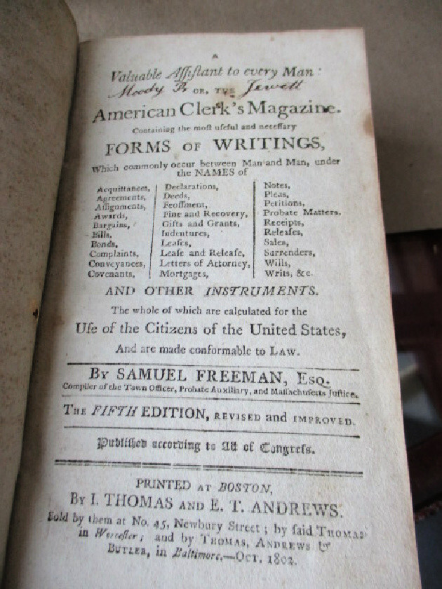 gw154. Forms of Writing and Other Useful Instruments, by Samuel Freeman, Esq. Pub'd. I.Thomas & E.T.Andrews, Boston, 1802. Fifth Edition, revised and improved. 24mo, 6 3/8" tall, 320 pages, index, 4 pages of ads. Full calf, good spine label. First 2 end papers with dime-sized hole, otherwise, Very Good+ condition. Do not hesitate to e-mail with any questions. As Always, Satisfaction Guaranteed! I expect to receive payment within 10 days, unless we have made other arrangements. Shipping will be USPS Media or First Class, depending on weight. If you prefer Priority mail, I will be glad to make the adjustment. I'm glad to combine multiple purchases in order to minimize shipping costs. I WILL SHIP INTERNATIONALLY, and I try to be as economical as possible with the shipping costs. RETURN POLICY: Satisfaction Guaranteed! Track Page Views With Auctiva's FREE Counter