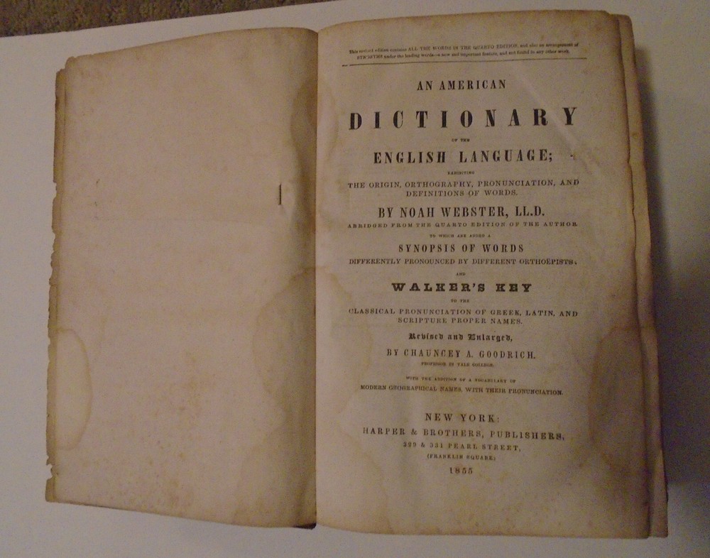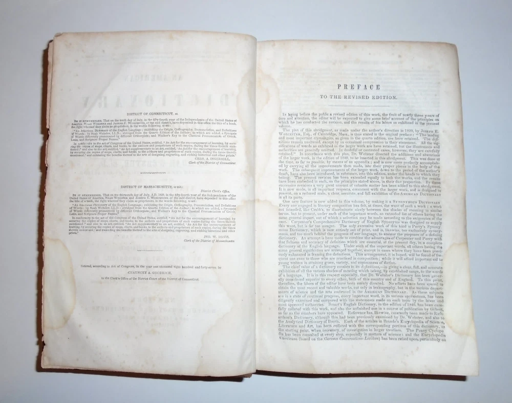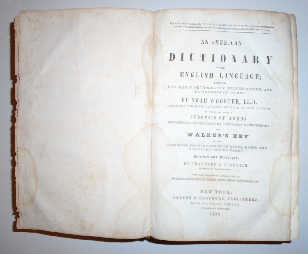 This is a rare and valuable copy of the American Dictionary of the English Language by Noah Webster, LL.D. Published by George and Charles Merriam in 1855, this original leather-bound edition is a must-have for any serious collector or lover of reference books. With its extensive coverage of English words and phrases, this dictionary is a treasure trove of linguistic knowledge that is as relevant today as it was in Webster's time. The third edition of this classic work is a testament to its enduring value and importance. It is beautifully bound in original leather and is a unit quantity item, making it a unique addition to any collection. Whether you are an English teacher, a student, or simply someone who loves words and their meanings, this dictionary is a must-have resource that will enrich your vocabulary and deepen your understanding of the English language.