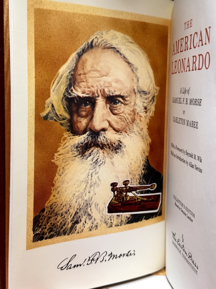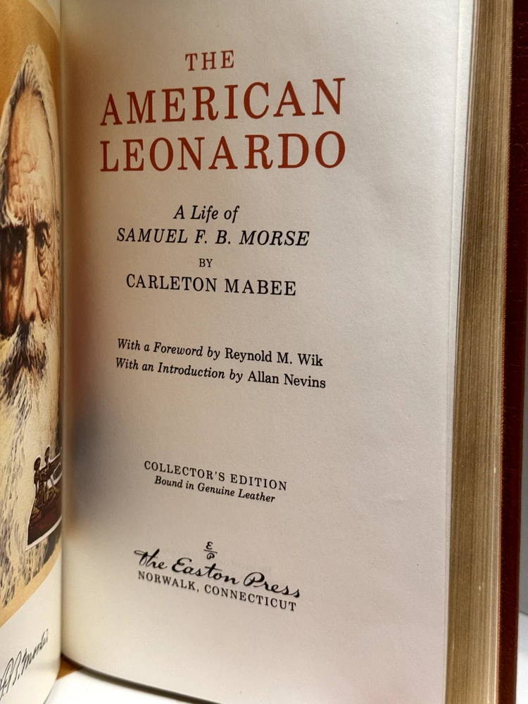You are bidding on a copy of a 1st Edition, 1st Printing of the Easton Press' LIBRARY OF GREAT LIVES series edition of Carleton Mabee's THE AMERICAN LEONARDO: A LIFE OF SAMUEL F. B. MORSE The book is about the life of Samuel F. B. Morse, inventor, scientist, and the creator of The Morse Code. Foreword by Reynold M. Wik. Introduction by Allan Nevins. Bound in beautiful genuine moroccan cowhide leather, the book features raised bars on the spine, gold tooling on the cover and spine, Moire ribbed endpages, satin silk sewn-in bookmark, 22k gold dust on page ends on all 3 sides. Printed on archival quality acid-neutral paper, that will last for generations without diminishing in quality or looks. LIMITED, COLLECTOR'S EDITION, PRINTED SPECIALLY FOR SUBSCRIBERS TO THE LIBRARY OF GREAT LIVES. Free Shipping in all of Continental United States. All other buyers, please check with me for shipping rates before bidding. See my other listings. I have a large collection of rare and collectible books, most leather-bound, others of first edition, first printing, even unpublished manuscripts. I will combine them during shipping so you can receive them together. Just message me your intent to buy more than one book, and I will hold them to be shipped together. Happy Buying!