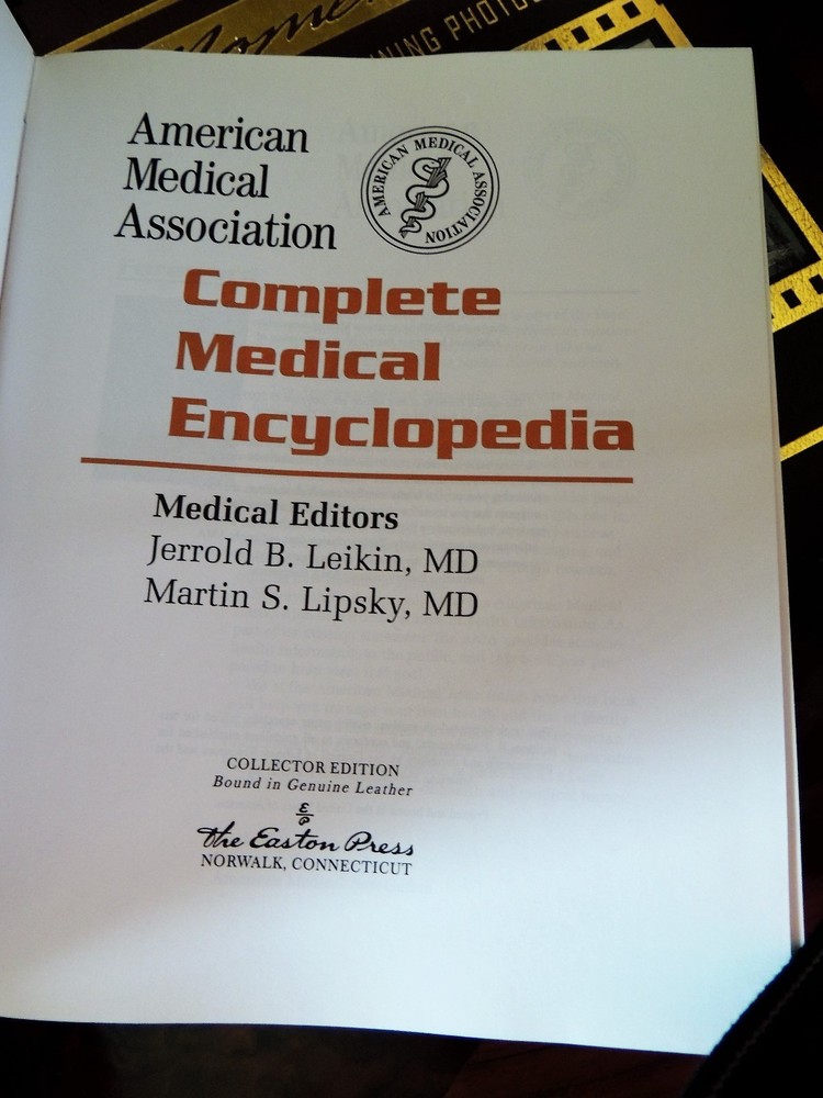 For your consideration, a FINE, UNREAD copy of THE AMERICAN MEDICAL ASSOCIATION COMPLETE MEDICAL ENCYCLOPEDIA IN A LARGE LUXURY LIMITED EDITION EXQUISITELY ILLUSTRATED WITH NUMEROUS COLOR PHOTOS IN AN EASTON PRESS HEIRLOOM VERSION FROM THEIR LIMITED EDITIONS SERIES- LONG OUT OF PRINT! A LARGE BEAUTIFUL BOOK WITH EXQUISITE ILLUSTRATIONS - PERFECT FOR THAT GIFT THAT WILL LAST FOR GENERATIONS TO ENJOY! Published by The Easton Press and currently out of print . THIS IS A TRUE COLLECTOR'S EDITION PUBLISHED BY THE EASTON PRESS IN FULL DARK BLUE AND 22KT GOLD LEATHER, SILK MOIRE ENDPAPERS, HUBBED SPINE, SATIN RIBBON, 22KT GILDING OF TITLES, COVER DECORATIONS AND PAGE ENDS, ARCHIVAL QUALITY PAPER. THIS MASSIVE RARE AND EXCEPTIONAL BOOK IS IN FINE CONDITION with no sign of previous ownership, ABSOLUTELY BEAUTIFUL! YOUR SATISFACTION IS GUARANTEED! A great collectible Easton Press title with excellent shelf appeal. S&H IS $4 FOR THIS FINE BOOK SET in the US ., others set after auction closes. I accept Paypal. Plse check my other fine book listings of Easton Press and Franklin Library full leather classic collector's editions and save on combined shipping. Bid with confidence. Add a map to your own listings. FREE Trial!