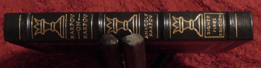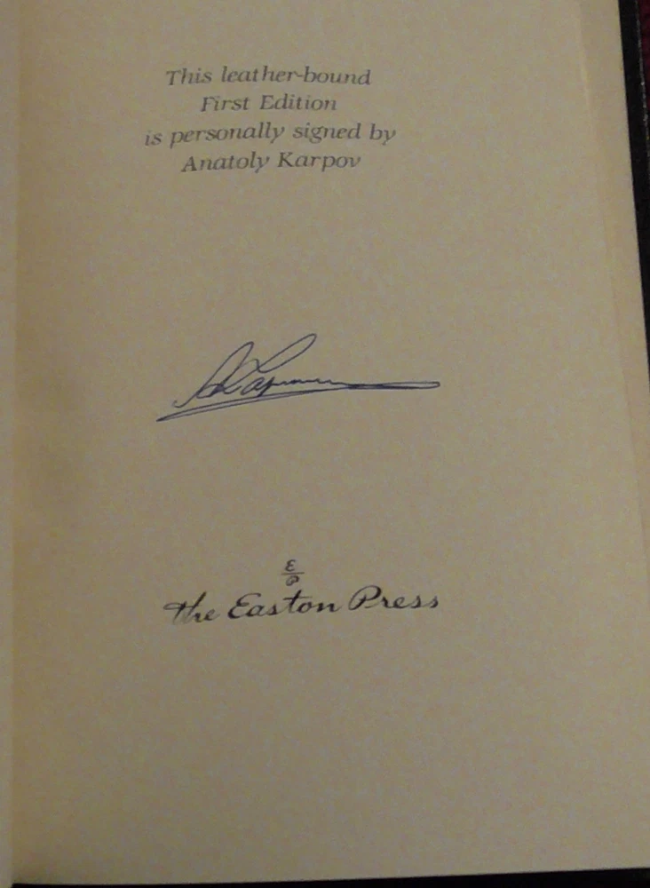 This is a leather bound signed first edition of Anatoly Karpov's best-selling memoir - "Karpov On Karpov", a fascinating book written by the famous Soviet Chess World Champion. Signed by the author. First edition. First Printing. One owner (myself). Smoke free home. Easton Press books are the golden standard in the publishing industry, highly collectible and lasting generations. Near-mint condition. No signature plate pasted on the inside cover. This is clean. I throw the signature plates out. Easton Press Full Genuine Leather Dubbed Spine Accented Wit 22 kt. Real Gold Satin Ribbon Page Marker Distinctive Cover Design Gilded Page Edges To Protect Against Humidity High Quality Acid - Free paper Smyth-Sewn Pages Silk-Moire Endleaves