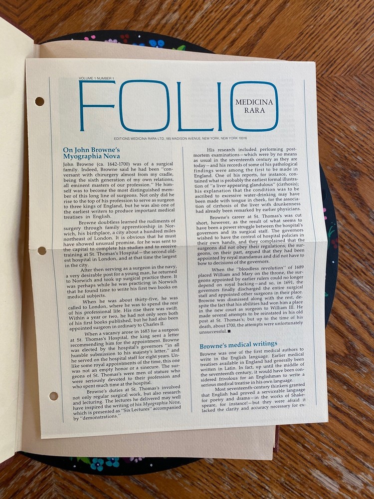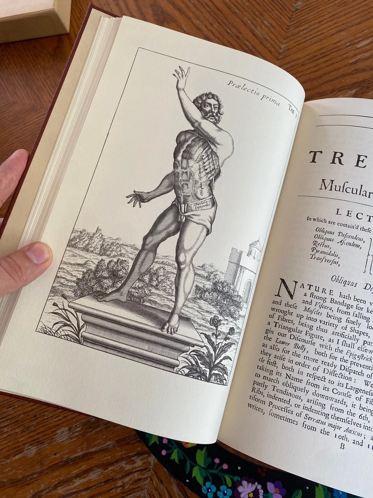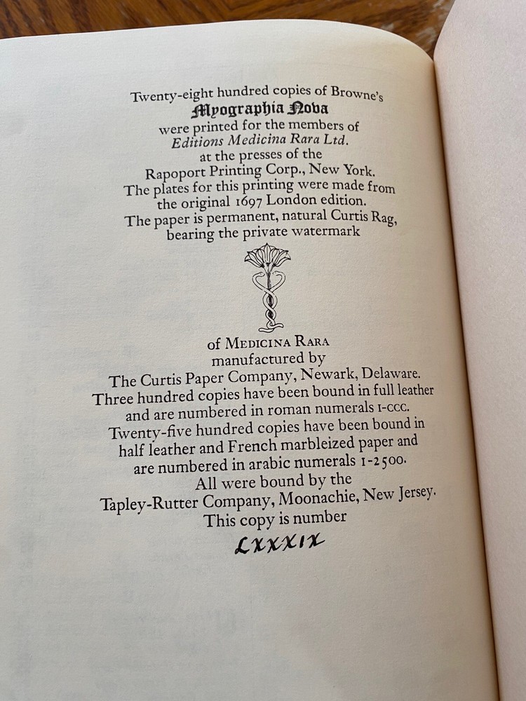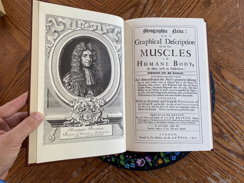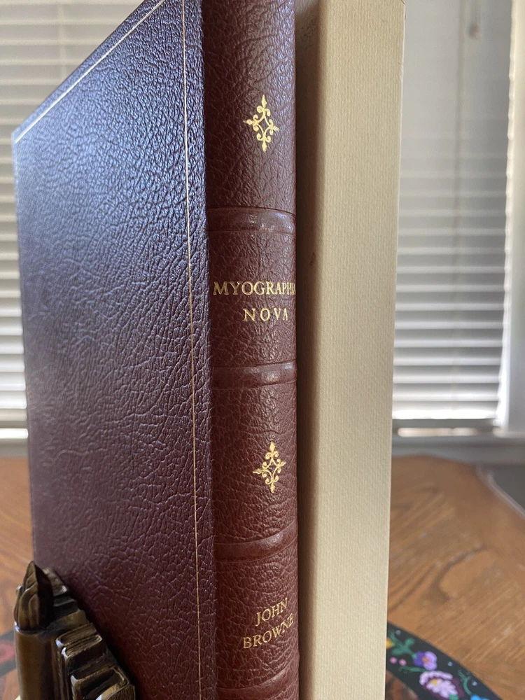 ๐ฏ๐๐๐ ๐๐๐๐๐๐, Here we have the 1971 limited edition facsimile bound in full leather of the 1697 anatomy text MYOGRAPHIA NOVA: OR, A GRAPHICAL DESCRIPTION OF ALL THE MUSCLES IN HUMANE BODY, AS THEY ARISE IN DISSECTION by John Browne and published by Editions Medicina Rara. This deluxe full leather edition was limited to 300 copies of which this is number LXXXIX (89 for you non romans). Included is the original Medicina Rara insert describing the book and its contents. Book is in excellent NEAR FINE condition with only minimal shelf wear and comes with it's original slipcase. Book is large at 12.25 x 8.25 inches. Please refer to pictures for more detailed information on condition. Thank you for considering this book, and as always, Godspeed, โญ ๐ฎ๐๐๐๐โ๐๐๐๐๐ โค