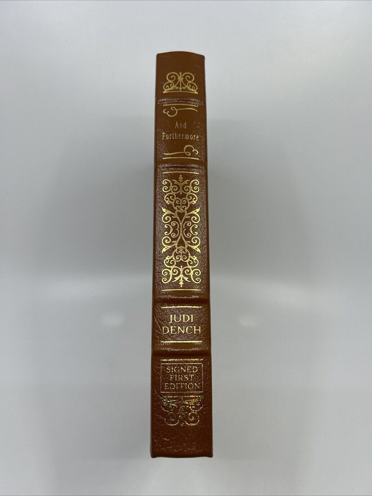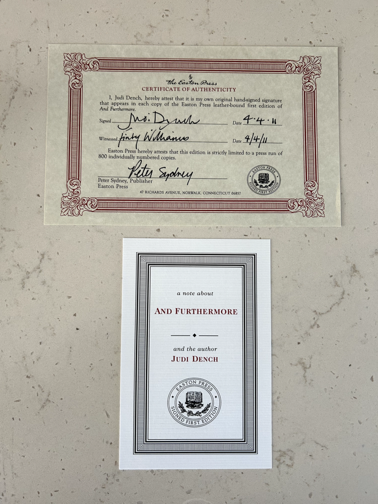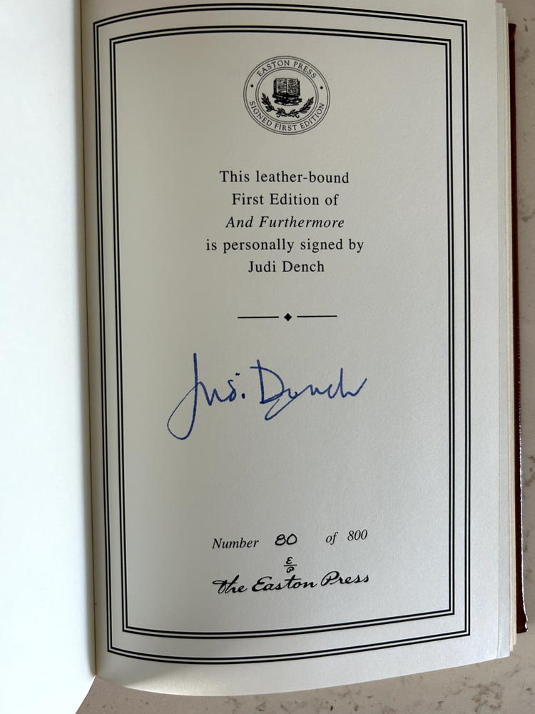 And Furthermore by Dame Judi Dench Signed leather bound 1st edition with COA, numbered 80 of 800 Like New - book has not been read, no bent pages Easton Press "Signed First Editions" (2011) Bound in fine genuine leather with 22K gold page edges Archival quality acid-free paper Domestic shipping only Returns accepted within 30 days