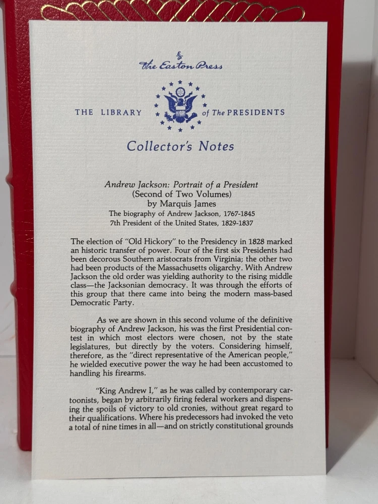 You are bidding on a very fine copy of a 1st Edition, 1st Printing of the Easton Press' THE LIBRARY OF THE PRESIDENTS series edition of William S. McFeely's GRANT - A Biography. This is a one-volume edition about the life and work of President Andrew Jackson. A Rarer edition than most in this series. Bound in beautiful genuine moroccan cowhide leather, the book features raised bars on the spine, gold tooling on the cover and spine, End-pages decorated with the seals of the U.S. Presidents, satin silk sewn-in bookmark, 22k gold dust on page ends on all 3 sides. Printed on archival quality acid-neutral paper, that will last for generations without diminishing in quality or looks. INCLUDES ORIGINAL, LIBRARY OF THE PRESIDENTS INSERT. LIMITED, COLLECTOR'S EDITION FROM THE SERIES OF THE LIBRARY OF THE PRESIDENTS. Free Shipping in all of Continental United States. All other buyers, please check with me for shipping rates before bidding. ***NOTE: If you are dissatisfied with your purchase for any reason, please contact me first directly, and I will do all in my power to make sure you are satisfied with your purchase. *** See my other listings. I have a large collection of rare and collectible books, most leatherbound, others of first edition, first printing, even unpublished manuscripts. I will combine them during shipping so you can receive them together. Just message me your intent to buy more than one book, and I will hold them to be shipped together. Abell Happy Buying!