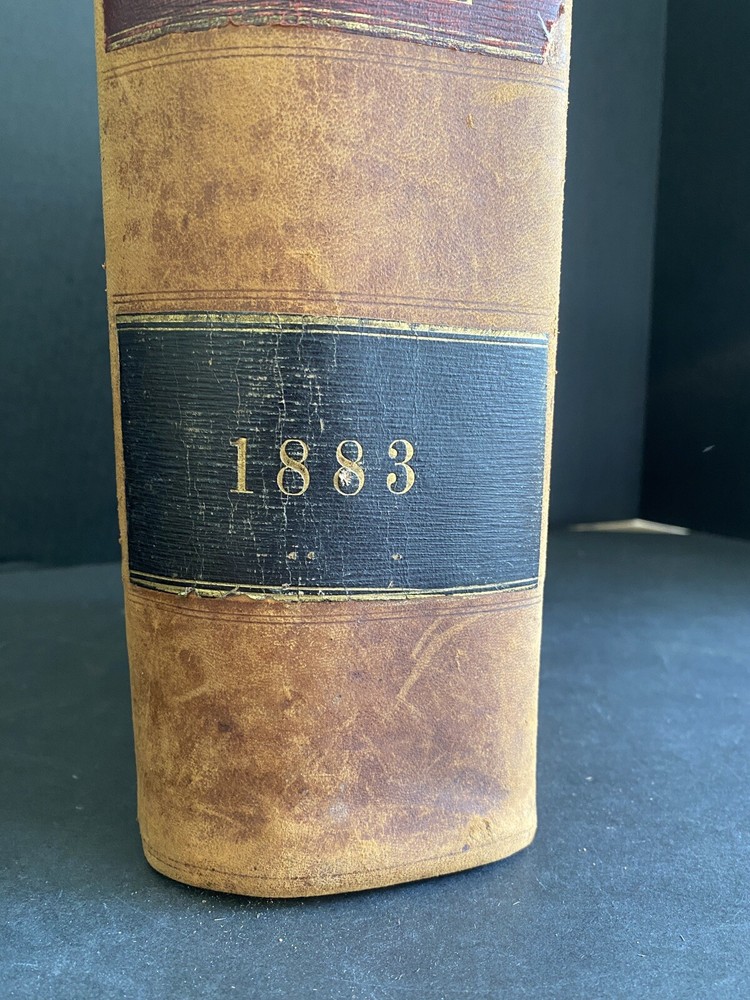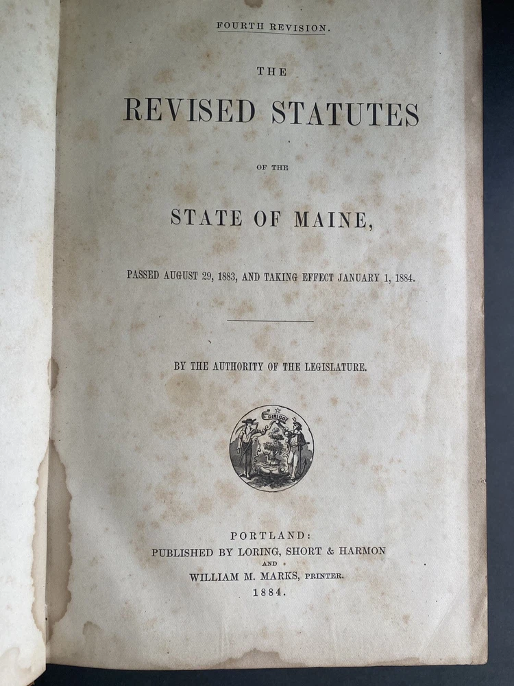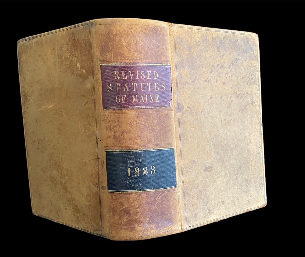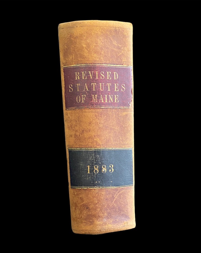 Revised Statutes of Maine 1883 Leather Cover Approximate size 11x7x4 Binding is intact. Wear on cover as shown. Front EL is torn as shown. Two pages inside are completely torn. Please see photos.