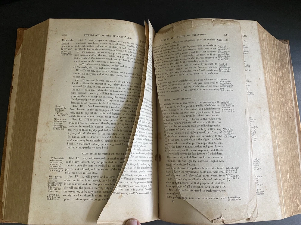 This antique Revised Statutes of Maine is a stunning vintage piece with incredible character! The leather cover has a beautiful aged look, and the binding is still solid despite some wear. The torn front and pages add to its authentic charm—perfect for collectors, decor, or staging. A true conversation starter with history!