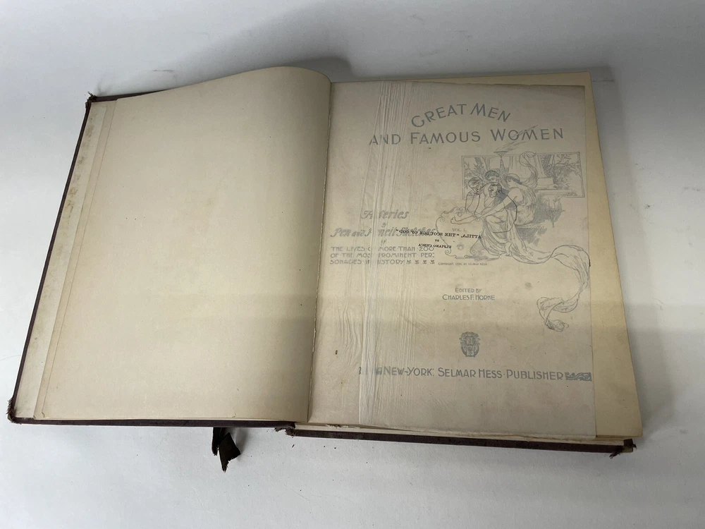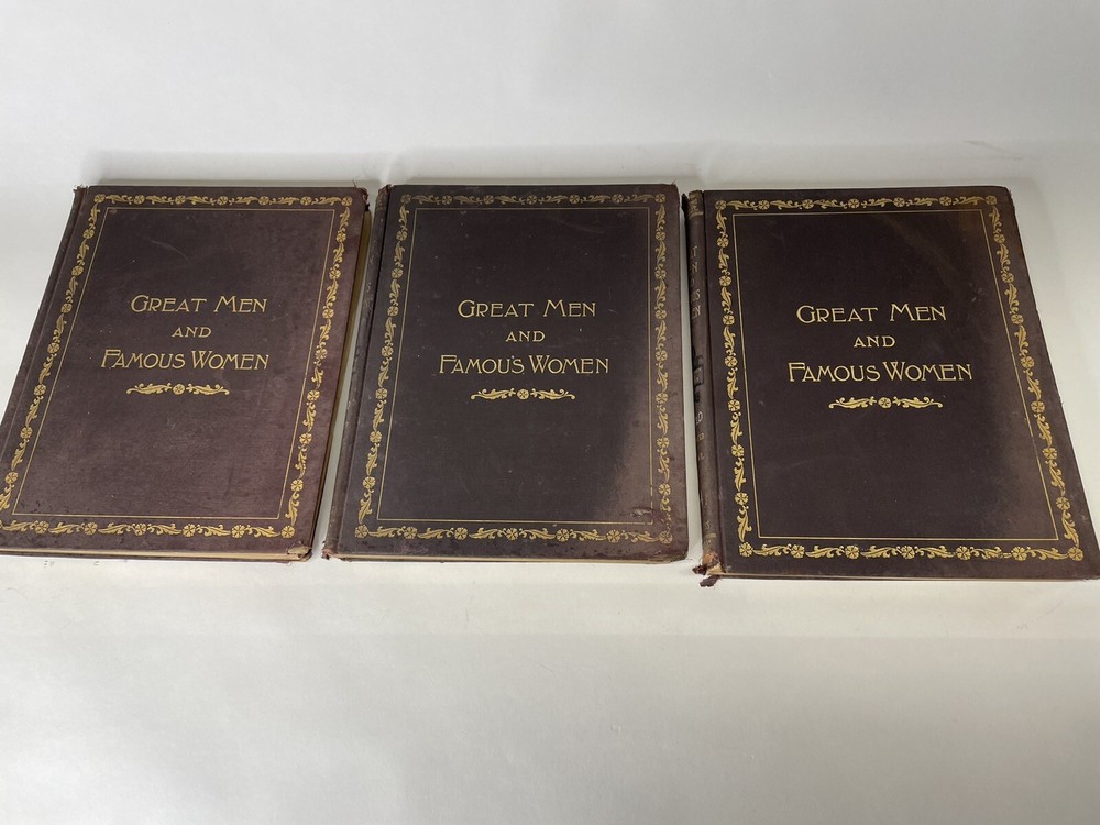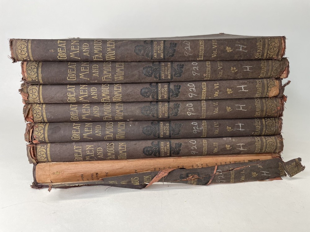 ANTIQUE Great Men and Famous Women 6 Vols Complete 1894 Illustrated. As you can see from the photos there is plenty of wear. Mainly to the binders. Most of them are loose or ripped. Volume 1 is hanging from the book as you can see. There are some creasing and yellowing of the pages. This includes volumes 1,2,4,5,6 and there are 2 copies of volume 8. If you have any questions please feel free to ask. Thanks for looking!