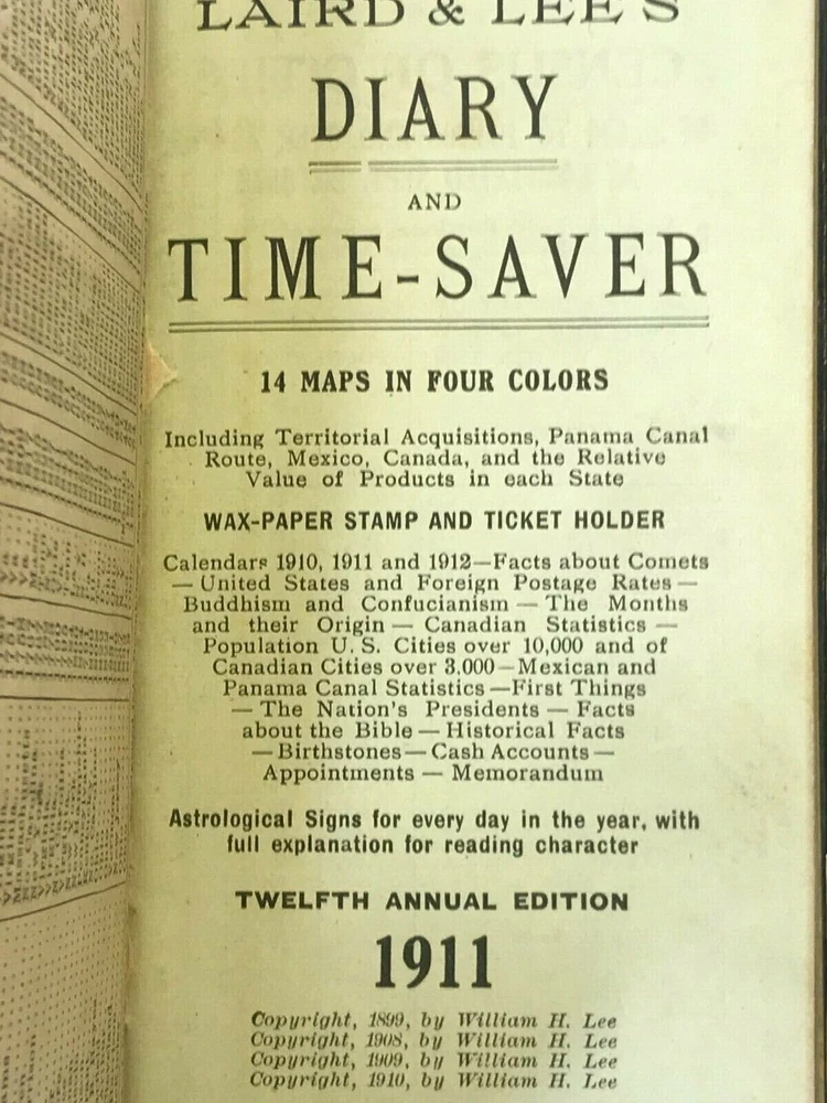 ANTIQUE LAIRD & LEES DIARY AND TIME-SAVER ~ LEATHER ~1911 Up for your consideration is this 1911 Laird & Lee's Diary and Time-Saver. This gold-embossed leather diary is in excellent vintage condition. It is remarkable that it is in such great condition being that it is over 100 years old. The black leather cover is still soft and supple. The embossed gold title is still in wonderful condition with no missing letters. The stars on the cover give it a patriotic look. Very interesting reading! This leather-bound diary measures 5 3/4 inches by 3 inches and has 99 pages. It was published by Laird & Lee's Publishing House of Chicago, Illinois. The binding is tight and secure. Edges of Book Cover Are In Terrific Shape. Leather Cover Is Soft and Supple. Pages Have Vintage Yellowing. It appears that the this item has never been used. Please review pictures as they are a part of the description. The item pictured is the exact item you will be receiving.