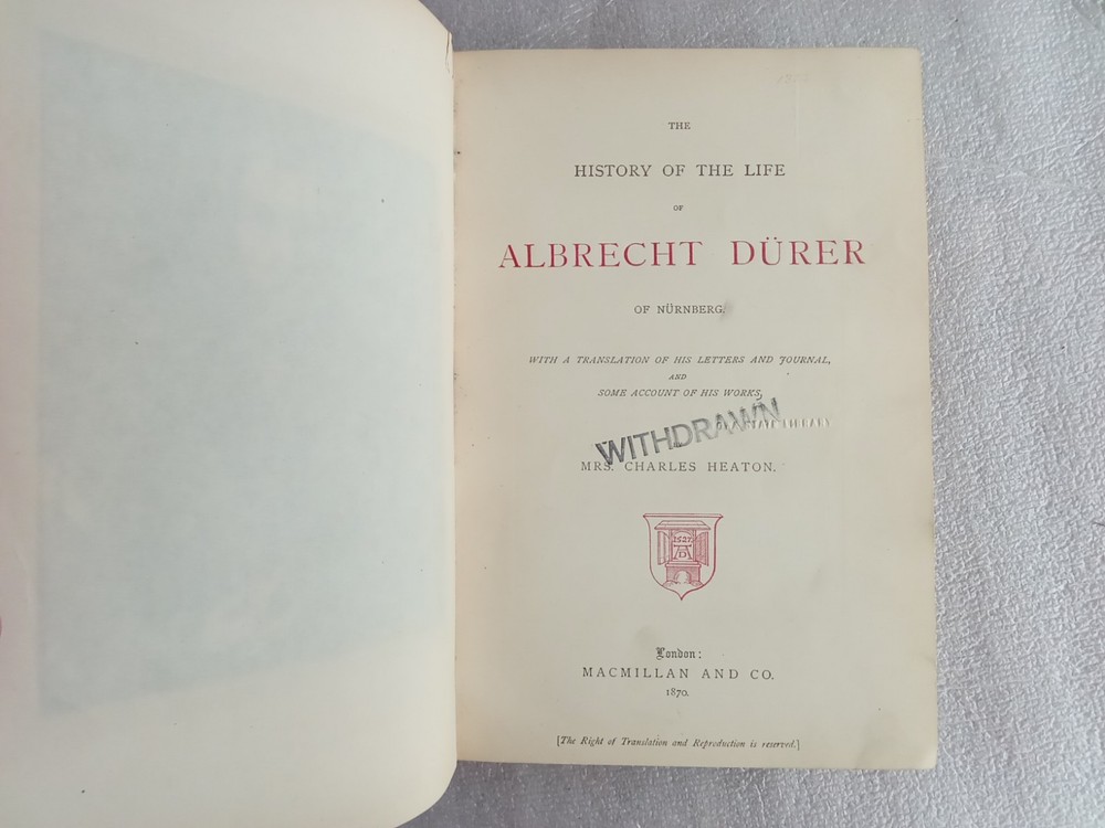 Mrs. Charles Heaton, The History of the Life of Albrecht Durer (1870) 10.1/4 inches high...