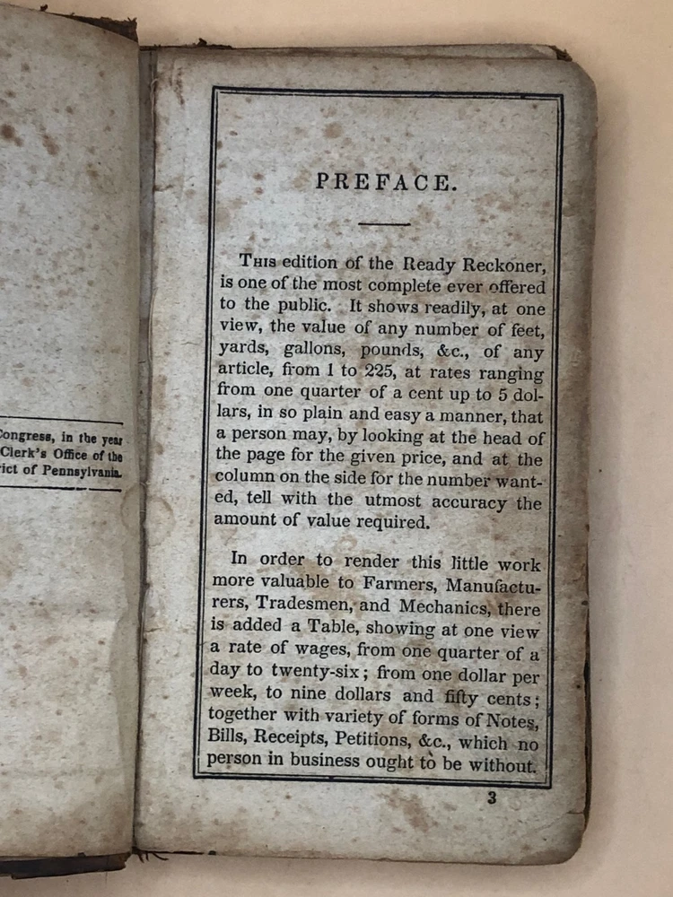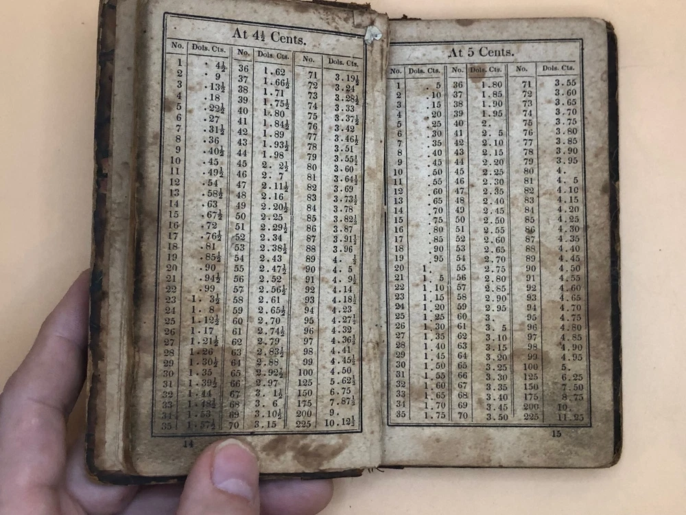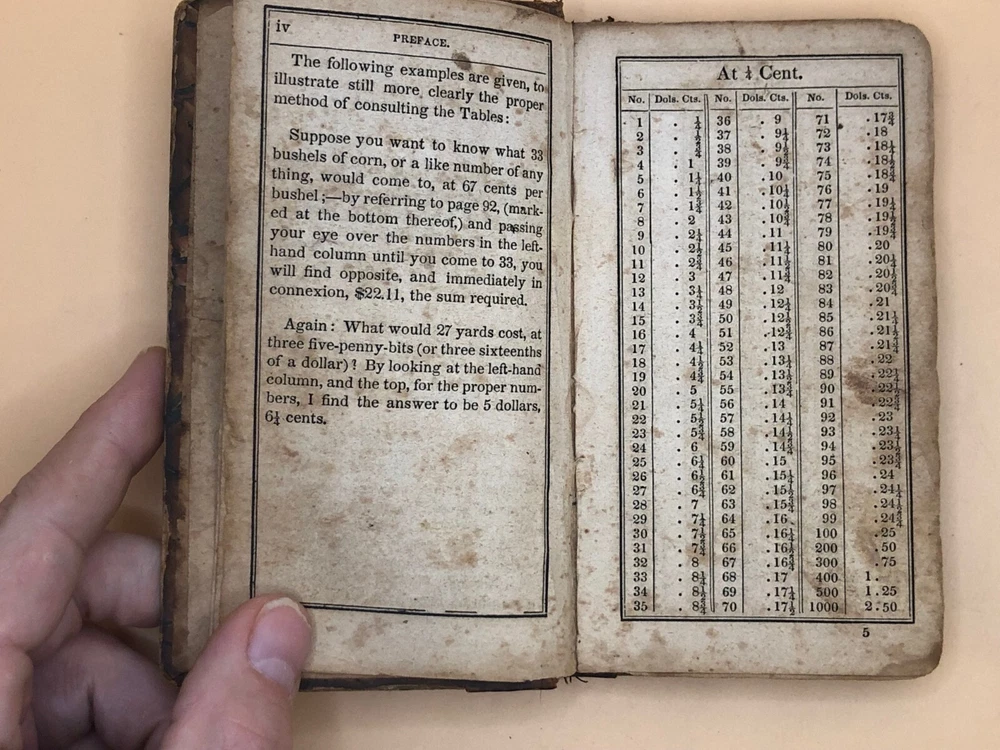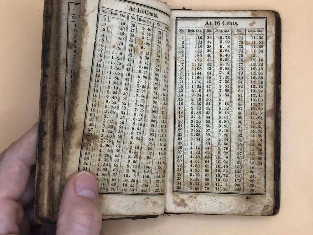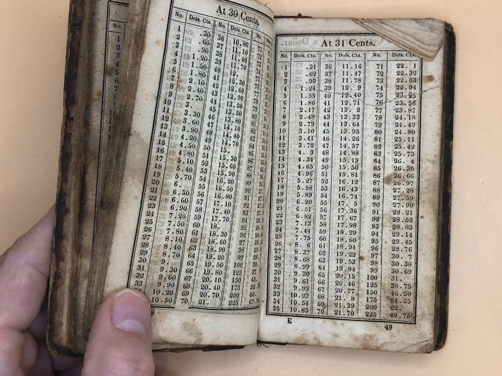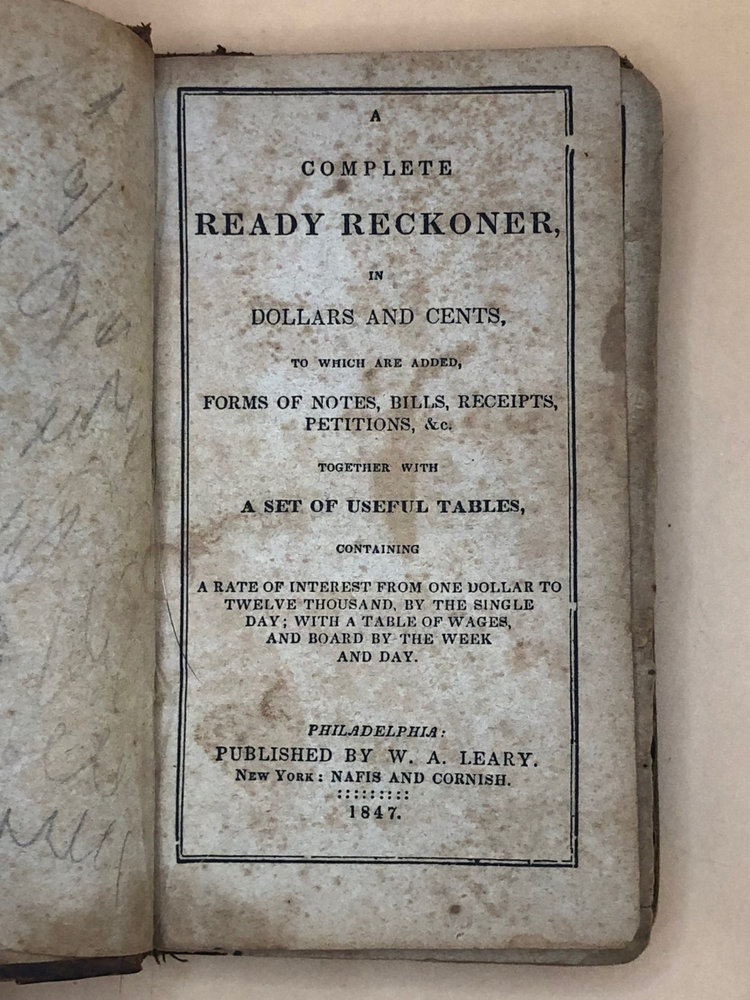 The Complete Ready Reckoner in Dollars and Cents . 1847 Leather book published by W.A. Leary. Please see photos for information on contents. ALL PHOTOS ARE OF ACTUAL BOOK WHICH WILL SHIP. Book will ship carefully wrapped in heavy paper and fitted snugly with a waterproof wrapper inside a heavy-duty cardboard box with bumpers to protect it during shipment. I am not a book warehouse! I am a book lover who takes the utmost care in shipping your books. Please see my feedback comments to verify this claim for yourself. FREE LOCAL PICK-UP AVAILABLE
