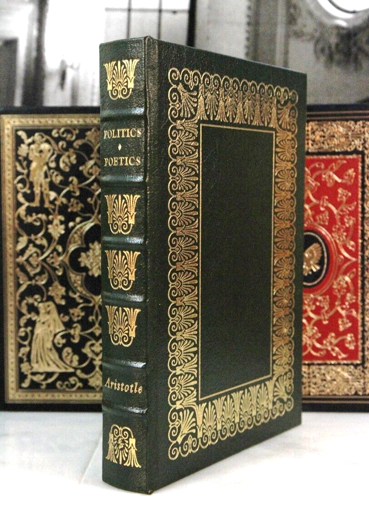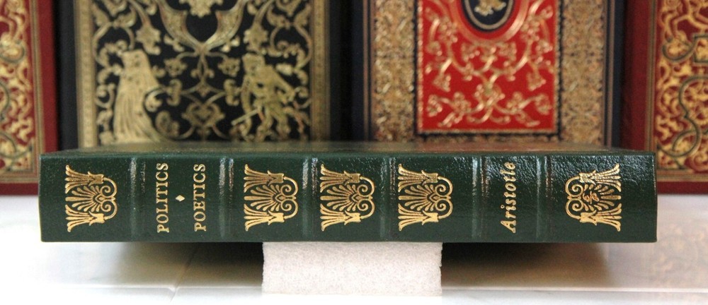 ***Copy of photos, personal formats, graphics, or text is prohibited . Ebay may drop listings with infractions. I review content regularly. 100 Greatest Politics and Poetics Author: Aristotle Illustrations by Description : One of the 100 Greatest Books of all time and a foundational title for a well appointed library of great thought. The classical Greek design elements on the spine and boards make a beautiful presence on the shelf. Rendered in beautiful gold against a green leather background, it is a stunning book! Condition : Leather is bright with only light sign of any shelf wear. Little marr to gilt page ends. This Fine Leather Book Features: Top grade, gold embossed/ornamented leather Gilded page ends to protect against dust and moisture Decorative end papers Acid neutral archival paper to last generations