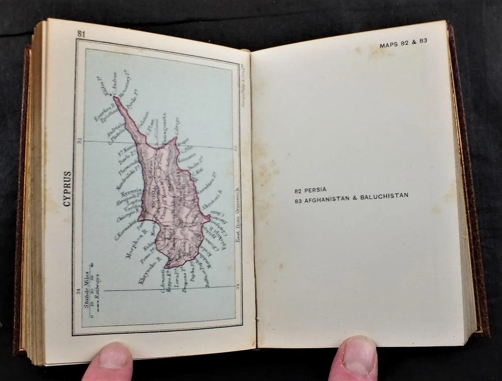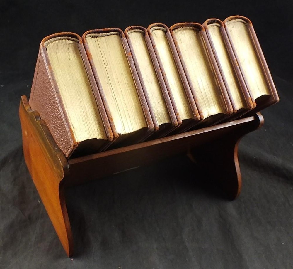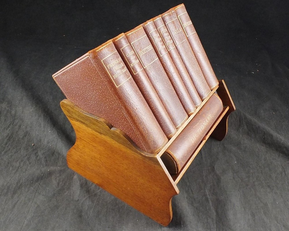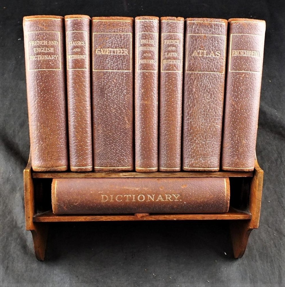 Essentially a very complete set with the folding plates chromolithos and panoramas intact ASPREY'S DESK LIBRARY Atlas dictionary gazetteer MOROCCO BOUND in original rack ASPREY'S DESK LIBRARY Atlas dictionary gazetteer MOROCCO BOUND in original rack Click images to enlarge Description ASPREY'S REFERENCE LIBRARY The full set of 8 volumes in the original bookstand, designed to sit on the desk. Dictionary, French/English Dictionary, Gazetteer, English Quotations, French and Latin Quotations, Atlas with full colour maps, Encyclopaedia, and Classics. Uniformly bound in gilt lined brown morocco, titles gilt, all edges gilt. The dictionary approx 15cm x 8.5cm, the other books all approx 12.5cm x 8cm. The whole standing approx 19cm high and 20cm wide. All in very good solid condition, some occasional foxing to the contents. The text blocks to the gazetteer and dictionary have at some point come loose from the case, and are now held in with a historic glue repair, and sit a little off centre, the tailband showing below the spine of the gazetteer, and they are split along both internal hinges. Morocco covers are solid but a touch dry, with some minor loss of surface to the heads and tails. Get images that make Supersized seem small. Showcase your items with Auctiva's Listing Templates! THE simple solution for eBay sellers. Track Page Views With Auctiva's Counter