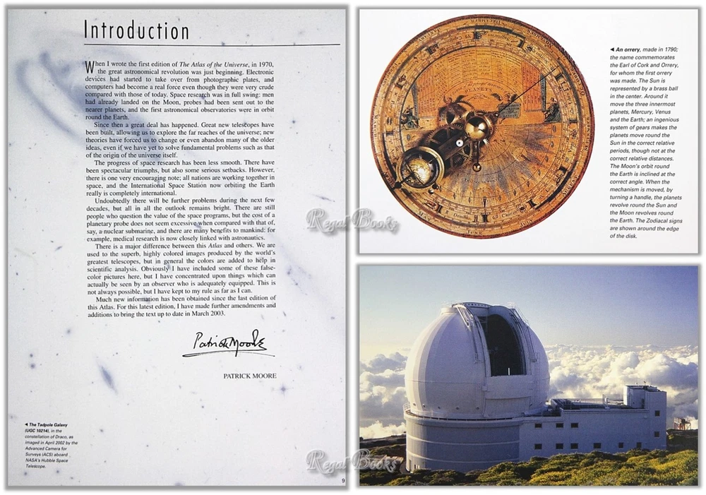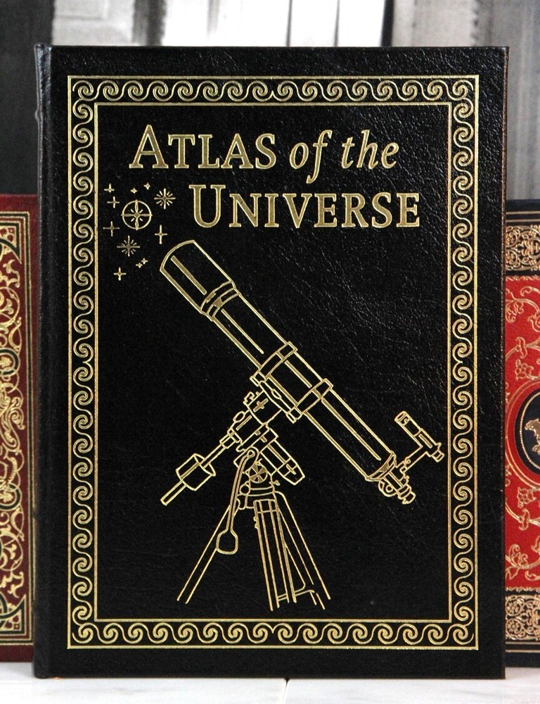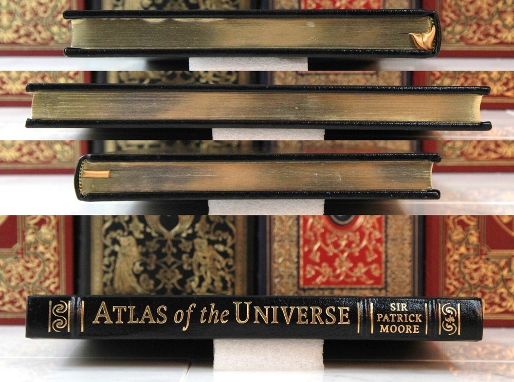 ***Copy of photos, personal formats, graphics, or text is prohibited . Ebay may drop listings with infractions. I review content regularly. Large Coffee Table / Art Books Atlas of the Universe Author: Sir Patrick Moore Illustrations by Description: A normally very scarce title and a nice oversized edition. More than 500 color images, 400 photographs, 70 maps, and 90 artworks. I have tried to mash up a bunch of illustrations just to show you a fraction of what is included in the book. The size of the book and gloss of the pages make this a hard one to photograph without professional equipment. -- Throughout human history, there has been no subject as fascinating and mysterious as the cosmos and our place in it. Atlas of the Universe is a gorgeously illustrated reference to the stars, planets, and beyond. This title is divided into numerous informative and visually stunning sections including: The Universe, The Solar System, The Sun, The Stars, and Star Maps. It includes many references to our endeavor to explore through space missions and even a little on viewing equipment. Just over 12" tall! Condition : Leather is bright with only little sign of shelf wear. Only light marr to gilt page ends for such a large book. The three long patches along the top page ends is from glare of the lights. There is a spot further to the outside, or right of those on the top page ends. Top section of the page ends photo. This Fine Leather Book Features: Top grade, gold embossed/ornamented leather Gilded page ends to protect against dust and moisture Decorative end papers Acid neutral archival paper to last generations