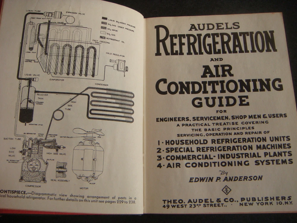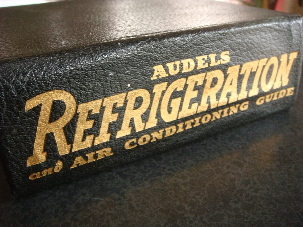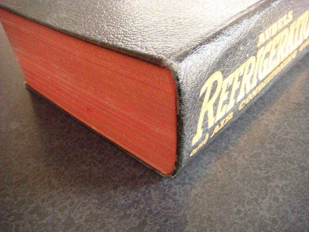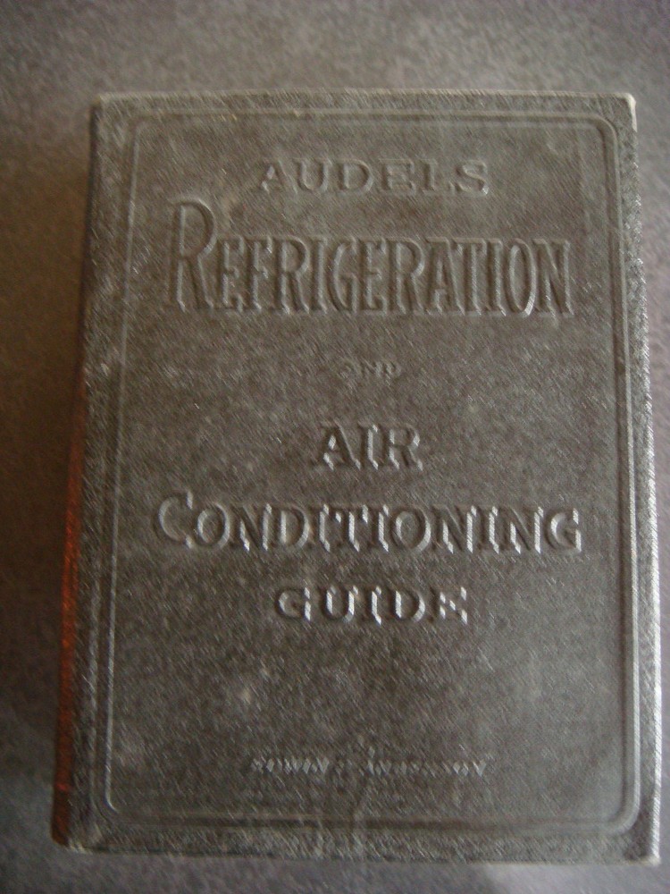 AUDELS REFRIGERATION AND AIR CONDITIONING GUIDE BY EDWIN P ANDERSON PRE-OWNED ITEM. NEW YORK THEO AUDEL & CO., PUBLISHERS REPRINT EDITION, 1946 BLACK LEATHER COVER WITH GILT TITLE ON SPINE HARDCOVER, 1242pp. RED EDGE PAGES. SLIGHT RUBBING AND TO COVER AND SPINE. ORIGINAL OWNERS EX LIBRIS ON INSIDE FRONT COVER. PENCIL MARKS ON INSIDE END PAGE. EXCELLENT REFERENCE BOOK!