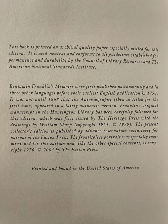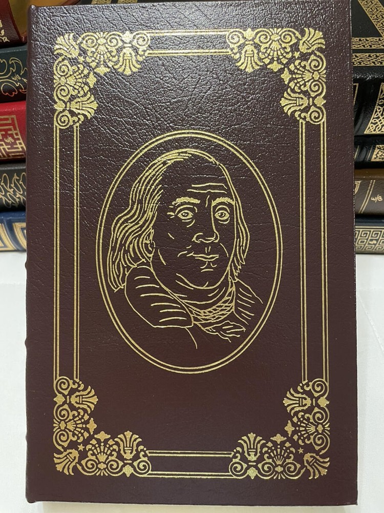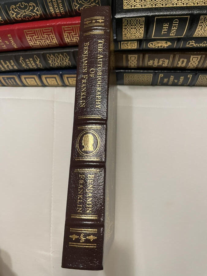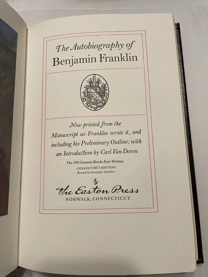 AUTOBIOGRAPHY BENJAMIN FRANKLIN Easton Press 2004 Hardcover Leather Ed 100 Greatest Books New Mint THE AUTOBIOGRAPHY OF BENJAMIN FRANKLIN by Benjamin Franklin Introduction by Carl Van Doren Easton Press © 2004 From the 100 Greatest Books Ever Written Series One of the most widely read of all autobiographies, Benjamin Franklin’s Autobiography is the unfinished record of his own life from 1771 to 1790. Published after his death, it has become one of the most famous and influential autobiographies ever written Collector's Edition Genuine Leather Bound Hardcover Mint Condition, never read, bookmark is in original position and fold! Printed and bound in the United States I am helping liquidate an estate for a friend. Her husband was an avid collector of books. I have hundreds to list, many rare and hard to find books. Please check back often as I will be listing new ones every day. Feel free to ask if you are looking for anything in particular. I will be listing many Folio Society books as well as the entire collection from the 100 Greatest Books ever written by Easton Press. Please email me with any questions. I will respond back quickly. I describe item conditions to the best of my ability and will always point out any flaws or defects that I am aware of. I am an EBay Seller with 100% Positive Feedback! Thank you. Bid with Confidence! See my other listings for more great items! Because I have had a slew of non paying and very slow paying bidders lately I will require payment within 2 days of the end of auction. However, if you need a different arrangement I will be more than happy to work with you, just let me know. INTERNATIONAL BUYERS ARE RESPONSIBLE FOR ALL CUSTOMS CHARGES, PORT CHARGES OR ANY TAXES DUE UPON RECEIPT OF THEIR PACKAGE. All my shipping charges include delivery confirmation. International shipping will be at actual cost. Thank you for bidding on my auctions. Your business is very much appreciated! txzj pxzj7585 txzj-11 txzj111 txzj115