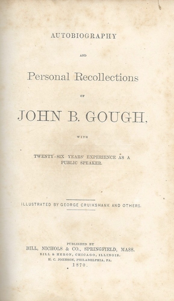AUTOBIOGRAPHY and PERSONAL RECOLLECTIONS of JOHN B. GOUGH With Twenty-Six Years Experience As A Public Speaker Illustrated by George Cruikshank and Others 1870, First Edition - later Print, Bill Nichols & Co., Springfield, MA, 552 pages. From the Introduction, “It may be asked…why I thought it requisite to add one to the already numerous autobiographies extant? I answer, that justice to myself…demands an explicit statement of the principal incidents in an hitherto eventful life; those incidents, or at least many of them, having…been erroneously described.” Gough was a transatlantic temperance celebrity and one of the most popular itinerant lecturers of the Victorian era. Enhanced with 9 full-page illustrations by George Cruikshank and Others. Hardcover book in Very Good condition, tight and clean with no marks. Pages are clean and white; some foxing on first few pages; covers are solid and hinges untracked. Brown leather covers with gilt titles on the spine are clean and bright; some rubbing of leather on front and wear at spine ends and corners. No dust jacket. Visit My Store (See Below) or Check "Popular Categories" for more items of interest.