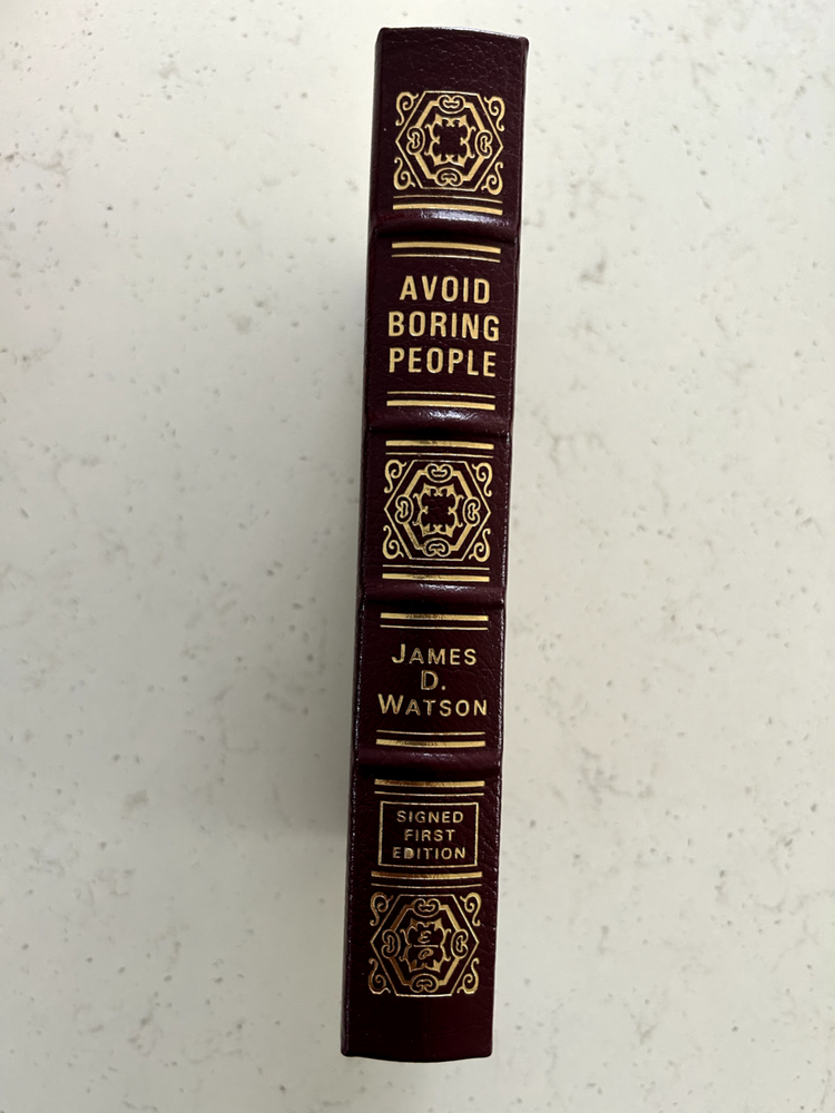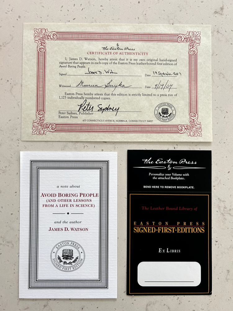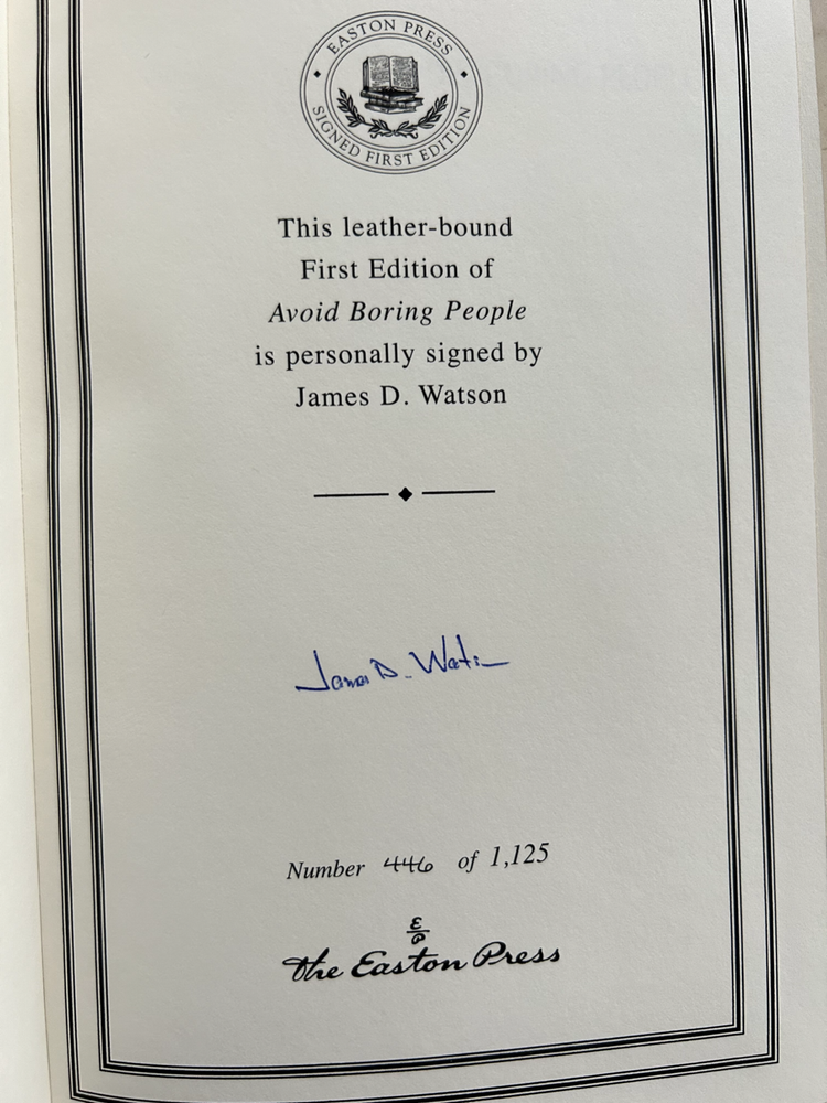 Avoid Boring People by James D. Watson Signed leather bound 1st edition with COA, numbered 446 of 1,125 Like New - book has not been read, no bent pages Easton Press "Signed First Editions" (2007) Bound in fine genuine leather with 22K gold page edges Archival acid-free paper Domestic shipping only Returns accepted within 30 days