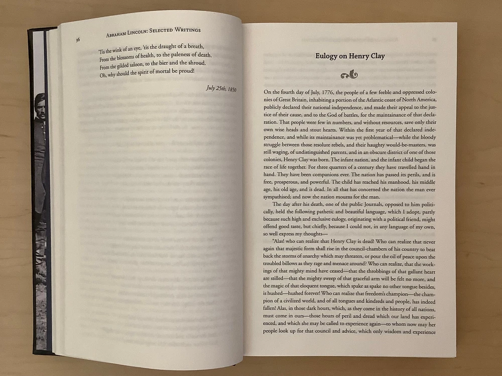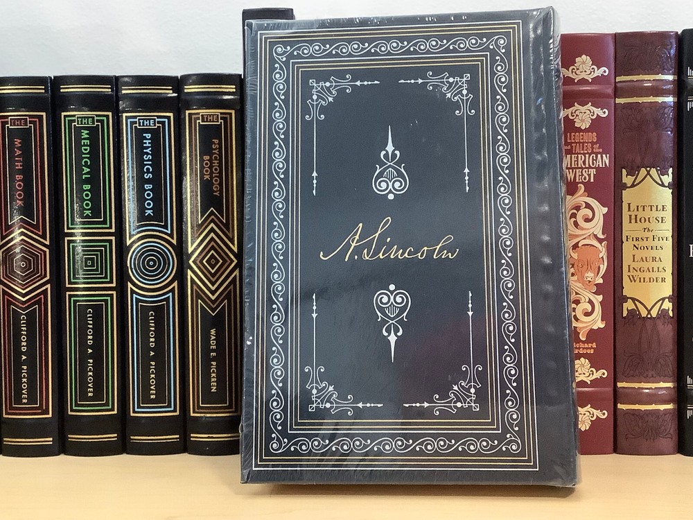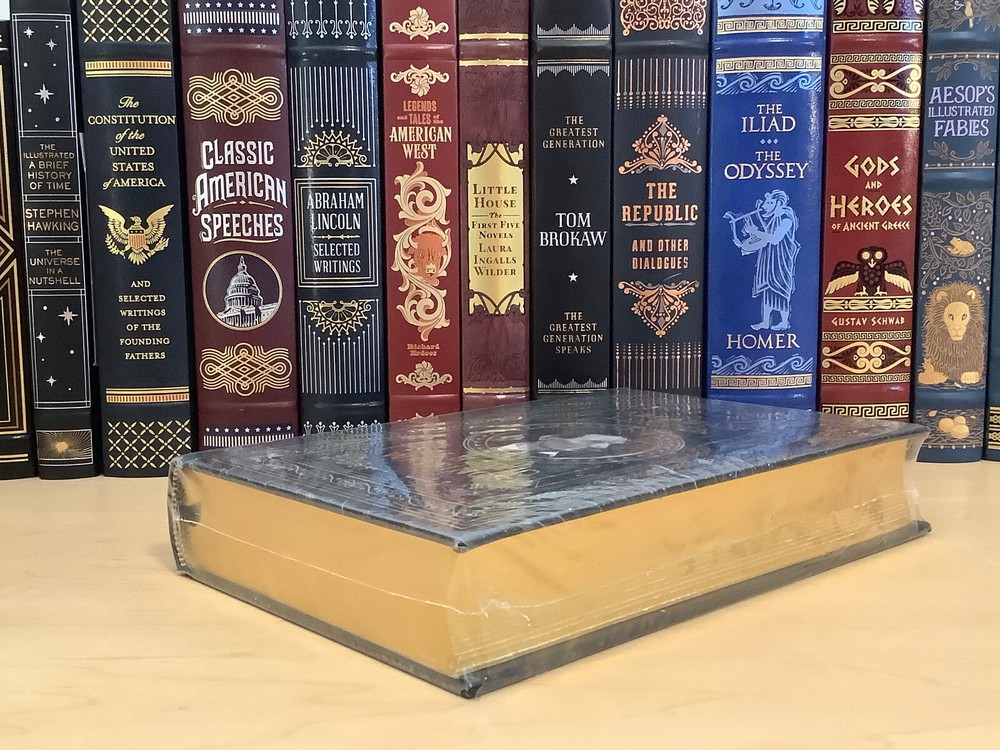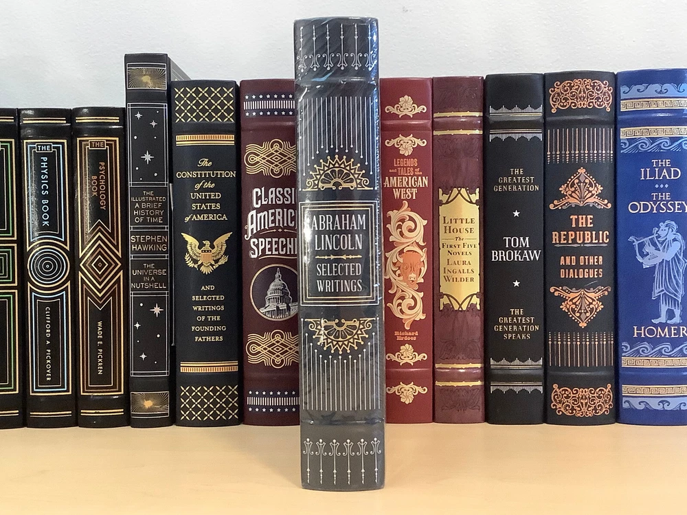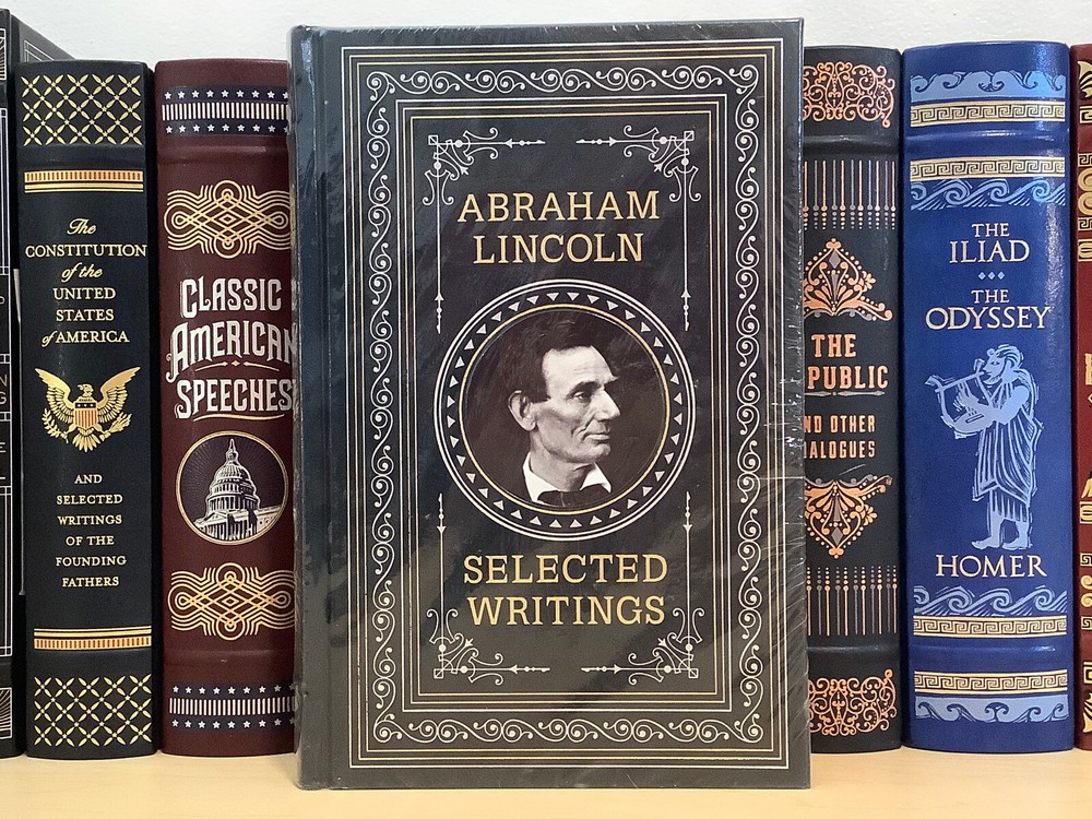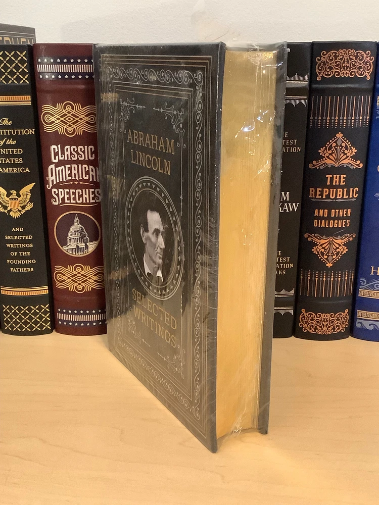 Abraham Lincoln – Selected Writings bound in leather, with gilt edged pages and a ribbon marker Item Condition: This is a leatherbound hardcover, sealed. The seal is open in areas, and there are flaws in the gilt page edging. The leather at the corners and spine have light rubbing and are bumped. Dimensions are approx: 9.25" x 6.25" x 1.5” This book will ship in a box with bubble wrap. Photos #1-9 are of the actual book that will be shipped, the rest are examples of the book from an open copy.