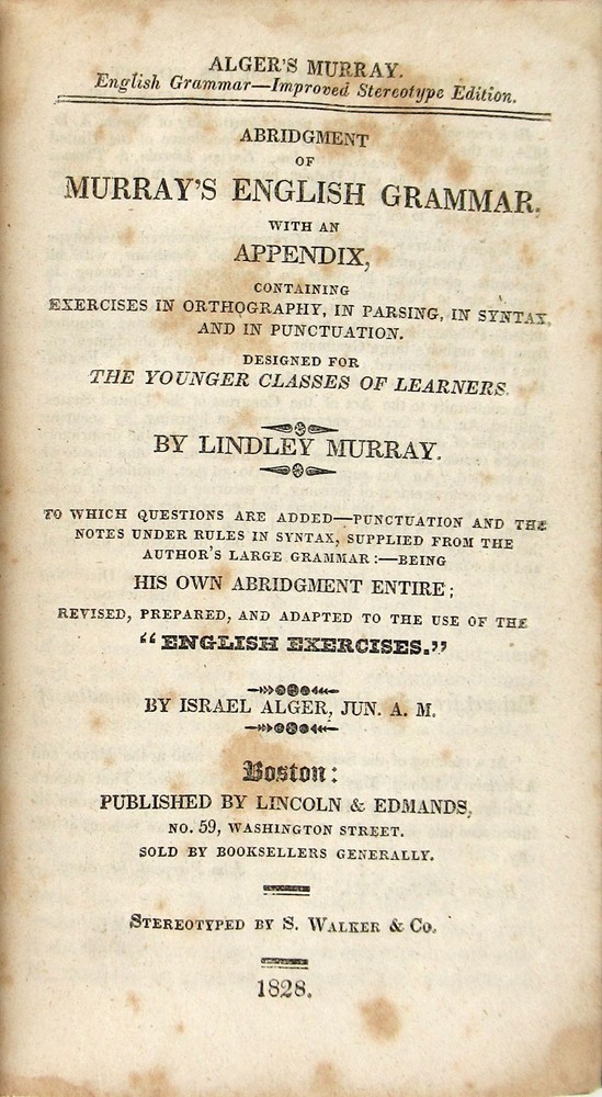 Abridgement of Murray's English Grammar [Alger's Murray] Author: Lindley Murray; Israel Alger [ed.] Title: Abridgement of Murray's English Grammar [Alger's Murray] Publication: Boston: Lincoln & Edmands, 1828 Description: Very Good. Boston: Lincoln & Edmands, 1828. Improved Stereotype Edition. 16mo (6" x 3.5"); 122pp. Blue paper-covered boards with brown leather spine. Boards rubbed with exposure along edges and corners, showing some general soiling and smudging to surface. Leather spine scuffed with splits starting along joints and spine ends and some fraying to leather. Front hinge cracked, but binding holding soundly. Moderate foxing throughout, but pages unmarked. Alger's abridgement of Murray's classic grammar. Seller ID: 9804 Subject: 19th Century, Education, Language, Reference Capitol Hill Books is a used bookstore located on historic Capitol Hill in Washington DC, with three floors of quality used books, first editions, and rare books. [Note: Our online inventory is stored and managed at a separate location from at our brick and mortar shop. If you have a question about an item listed online, please send a direct message here rather than calling the store so that we can make sure someone familiar with the item in question can respond.] Terms Books described only as First Editions are First Printings unless otherwise specified. All items are guaranteed to be as described or they may be returned within 30 days of receipt for a full refund. All orders ship within two business days. Standard mail is USPS Media Mail. Expedited and international shipping are also available (please contact for estimates). We offer combined shipping on multiple orders. This listing was created by Bibliopolis.