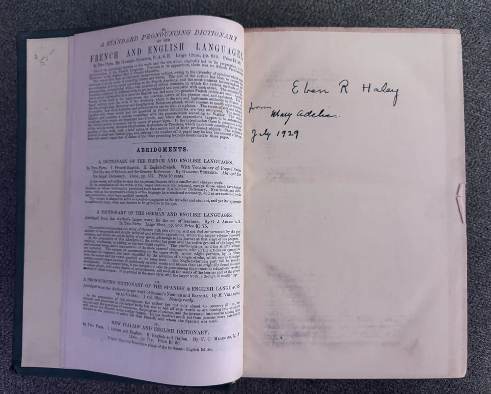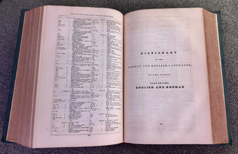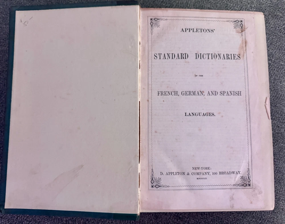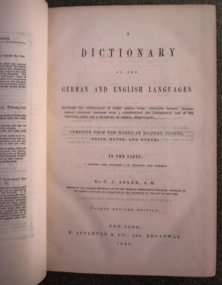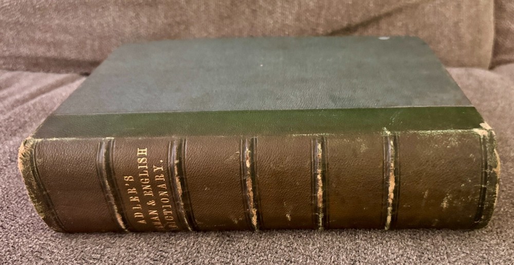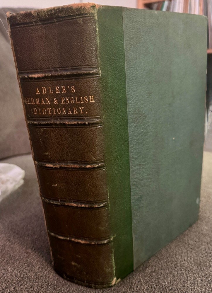 Description: For sale is a rare and antique 1852 Fourth Revised Edition of A Dictionary of the German and English Languages by G.J. Adler , published by D. Appleton & Co., New York . This comprehensive dictionary is bound in a beautiful half-leather hardcover binding with raised bands on the spine and gilt lettering . It features over 1,000 pages of German-English and English-German translations, including pronunciation guides and lists of irregular verbs. This dictionary is a must-have for collectors of antique language books, historical linguists, or those interested in 19th-century German-English translation resources . Adler’s dictionary was widely regarded as a key reference tool for German language learners in the 19th century. Features: • Antique 1852 Edition – Nearly 175 years old! • Publisher: D. Appleton & Co., 200 Broadway, New York • Leather Spine with Raised Bands & Gold Gilt Lettering • Contains Both German-English & English-German Sections • Over 1,000 Pages of Content • Historical & Collectible Linguistic Resource Condition: • Exterior: The leather spine shows some wear, particularly along the edges and corners, with some scuffing and minor loss at the edges. The green cloth boards have general wear but remain intact. • Binding: The book remains intact and secure , though the hinges show typical signs of age. • Interior: Pages are clean with some light age-related toning. Some foxing and minor staining are visible on the endpapers. No major writing or damage inside. • Mild spotting on inner boards (see photos for details). This is a well-preserved, authentic 19th-century language dictionary that would make a fantastic addition to any antique book collection. Shipping & Packaging: • Carefully packaged in protective wrapping to ensure safe delivery. Don’t miss the opportunity to own this rare and historically significant dictionary!
