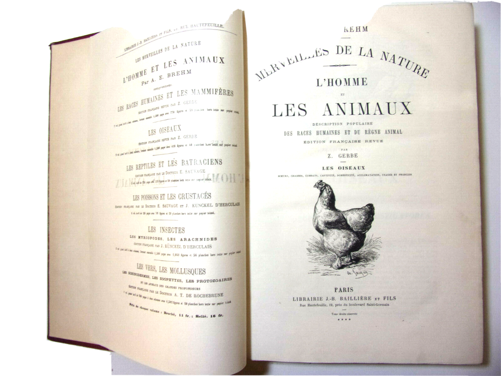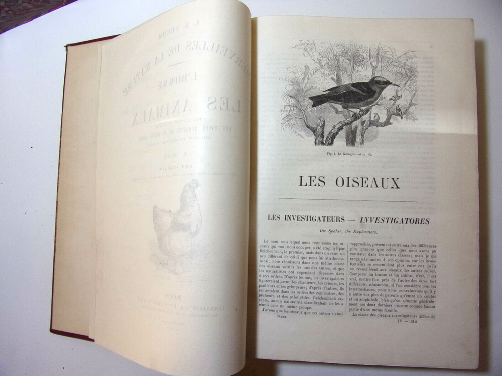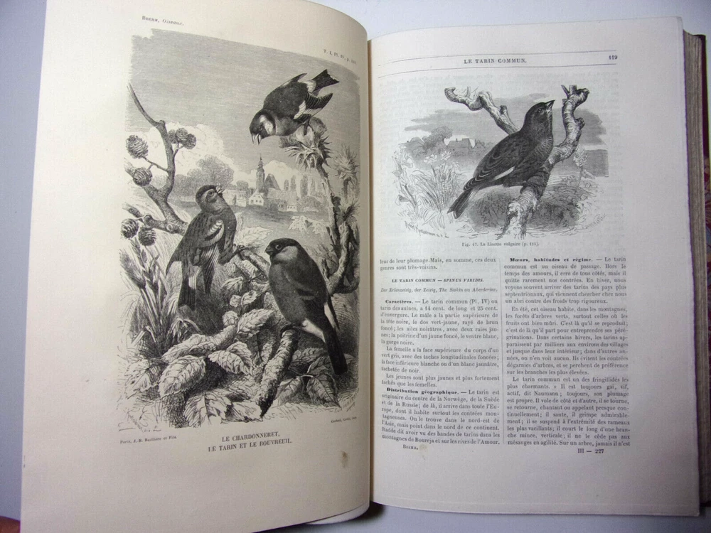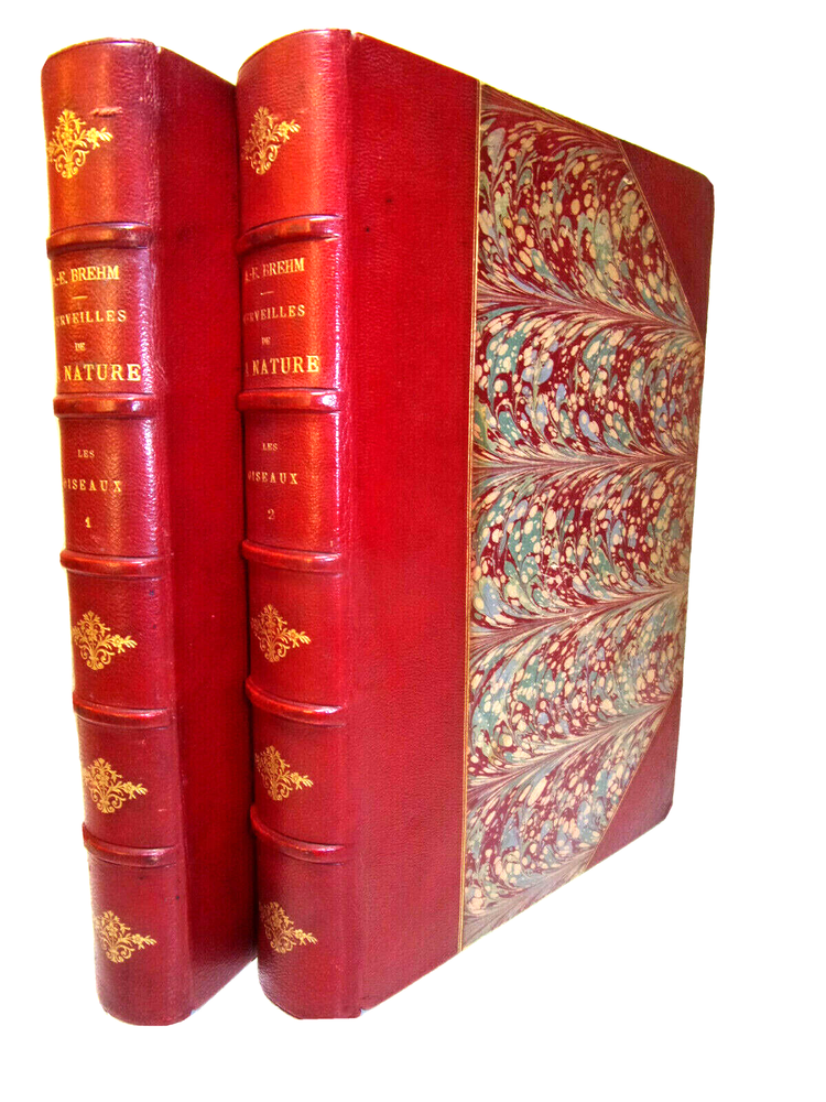 A.e Brehm. The Man and the Animals. The Birds ( 2 vols) The description of this item has been automatically translated. If you have any questions, please feel free to contact us. AE Brehm. Man and animals. The birds (2 flights) popular description of human races and the animal kingdom, French edition revised by Z. Gerbe Complete in 2 large volumes in-4, 20x29, half leather bound, gilded head edges, 790 and 905 pages. Very numerous figures in black in the text and outside the text. The work is still a reference among naturalists for its encyclopedic and humanist character. Brehm has written a popular work, he has notably simplified the classification so that the neophyte can easily find what he is looking for. Drawing on his experience in Africa, he embellishes certain articles with the notion of hunting, beautiful copies of this pretty book, witness to an era where animal diversity still surprised most. Paris, Baillière & Fils, circa 1880 AE Brehm. Man and animals. The birds (2 flights) popular description of human races and the animal kingdom, French edition revised by Z. Gerbe Complete in 2 large volumes in-4, 20x29, half leather bound, gilded head edges, 790 and 905 pages. Very numerous figures in black in the text and outside the text. The work is still a reference among naturalists for its encyclopedic and humanist character. Brehm has written a popular work, he has notably simplified the classification so that the neophyte can easily find what he is looking for. Drawing on his experience in Africa, he embellishes certain articles with the notion of hunting, beautiful copies of this pretty book, witness to an era where animal diversity still surprised most. Paris, Baillière & Fils, circa 1880 Reliure Cuir Caractéristiques spéciales Illustré Langue Français Auteur Brehm Époque XIXème Sujet Ouvrages de référence Nom oiseaux