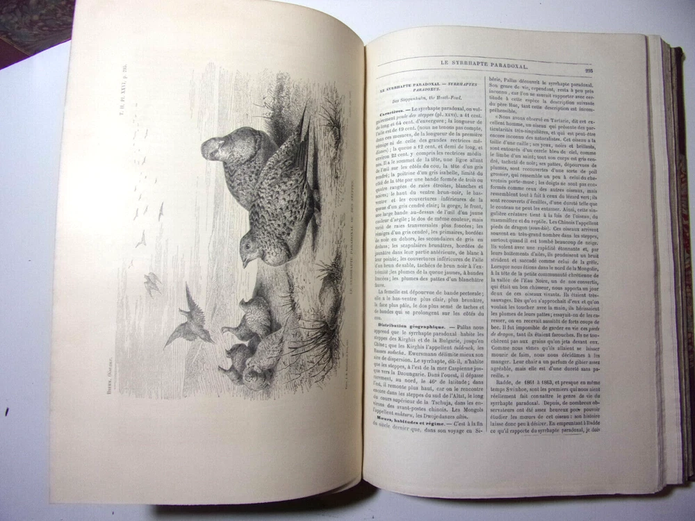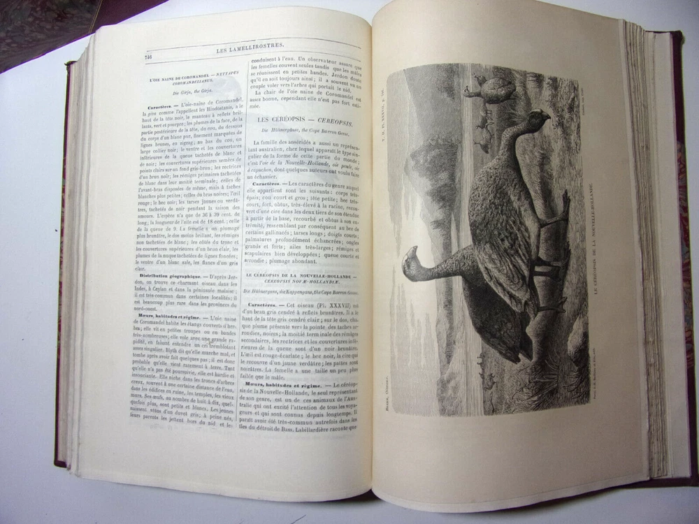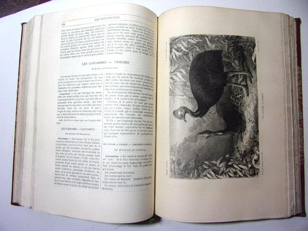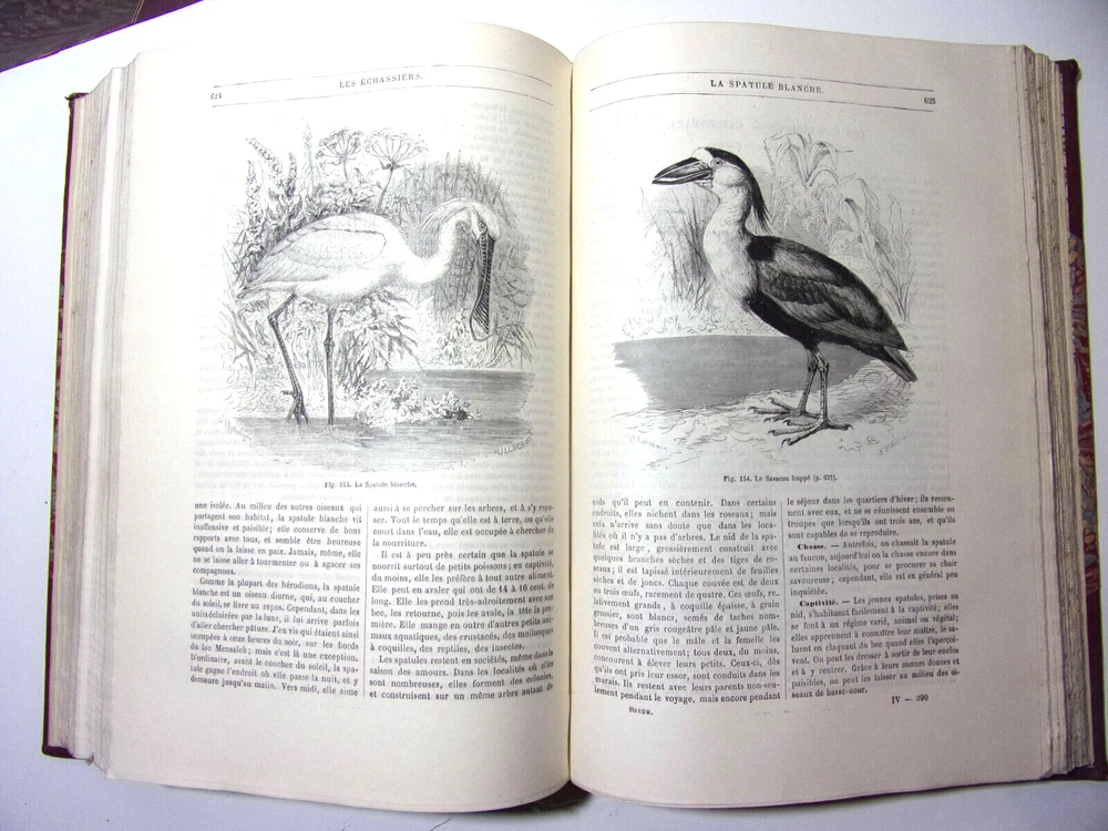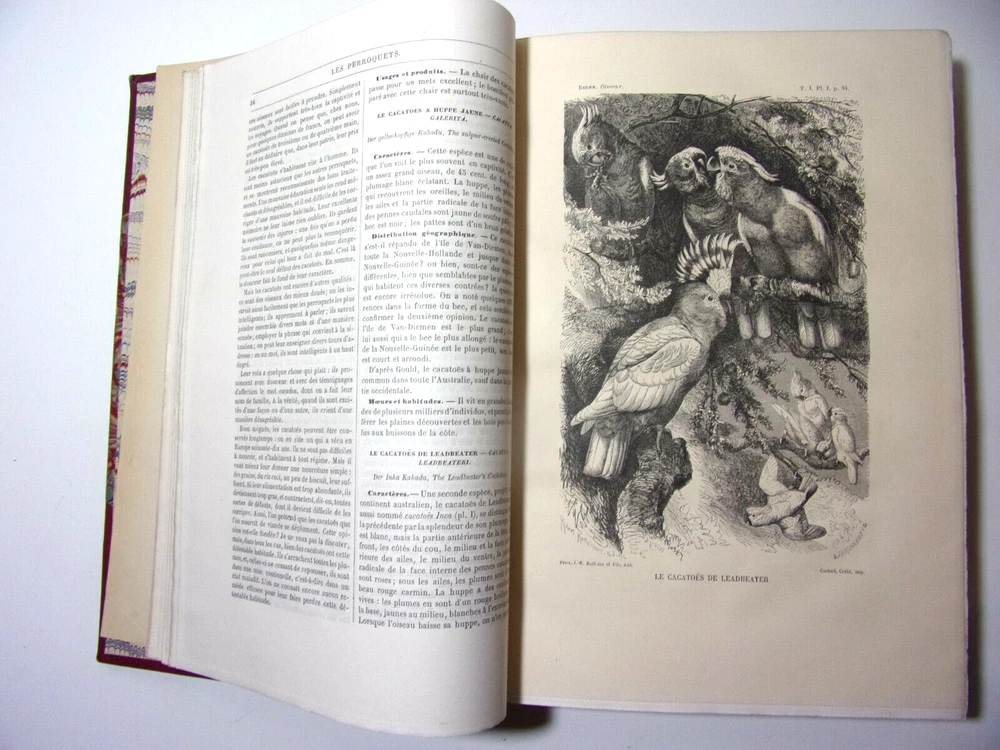A.e Brehm. The Man and the Animals. The Birds ( 2 vols) The description of this item has been automatically translated. If you have any questions, please feel free to contact us. AE Brehm. Man and animals. The birds (2 flights) popular description of human races and the animal kingdom, French edition revised by Z. Gerbe Complete in 2 large volumes in-4, 20x29, half leather bound, gilded head edges, 790 and 905 pages. Very numerous figures in black in the text and outside the text. The work is still a reference among naturalists for its encyclopedic and humanist character. Brehm has written a popular work, he has notably simplified the classification so that the neophyte can easily find what he is looking for. Drawing on his experience in Africa, he embellishes certain articles with the notion of hunting, beautiful copies of this pretty book, witness to an era where animal diversity still surprised most. Paris, Baillière & Fils, circa 1880 AE Brehm. Man and animals. The birds (2 flights) popular description of human races and the animal kingdom, French edition revised by Z. Gerbe Complete in 2 large volumes in-4, 20x29, half leather bound, gilded head edges, 790 and 905 pages. Very numerous figures in black in the text and outside the text. The work is still a reference among naturalists for its encyclopedic and humanist character. Brehm has written a popular work, he has notably simplified the classification so that the neophyte can easily find what he is looking for. Drawing on his experience in Africa, he embellishes certain articles with the notion of hunting, beautiful copies of this pretty book, witness to an era where animal diversity still surprised most. Paris, Baillière & Fils, circa 1880 Reliure Cuir Caractéristiques spéciales Illustré Langue Français Auteur Brehm Époque XIXème Sujet Ouvrages de référence Nom oiseaux