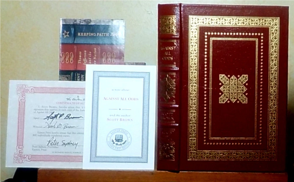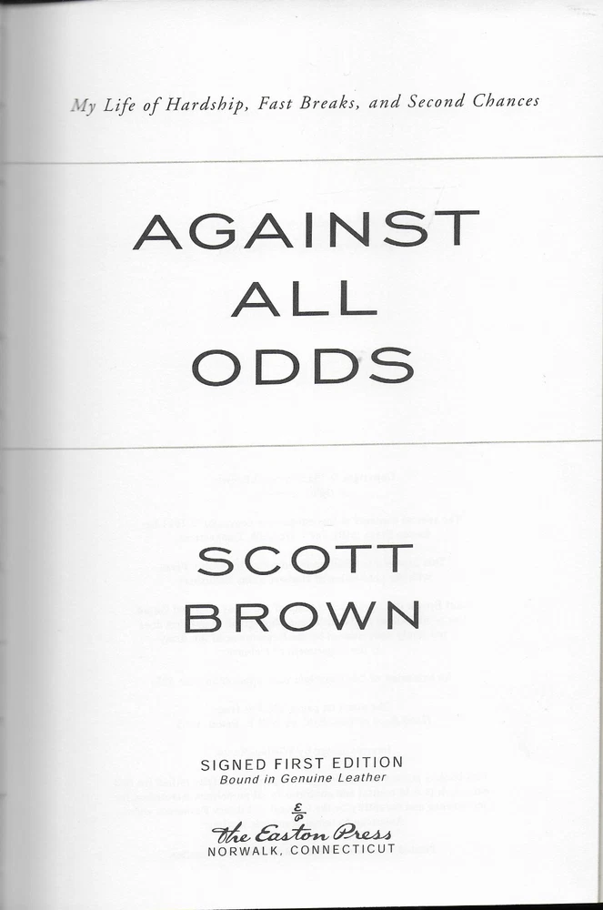 Against All Odds by Scott Brown, Easton Press, Signed COA & Easton Press Note You are b uying Against All Odds by Scott Brown . The Easton Press, Norwalk, CT published the book special contents copyright 2011 . The book is a signed limited first edition. It is copy # 549 of an edition of 800 copies. Scott Brown signed the limitation page. He also signed the page facing the title page with inscription “keep the faith!” and the number 41 under his signature. I assume this was given to a supporter in his failed Senate reelection. The interior, attached bookmark, and leather bound cover are in fine condition. The book is 6 1/ 4 ” x 9 1/ 4 ” tall and 32 5 pages. There are 49 photographs.. Laid in the front is the signed Easton Press Certificate of Authenticity, Easton Press Note brochure, and an Easton Press Library of the Presidents brochure . Please if you need any additional information and photos, eBay message me immediately. Combine Shipping Discount!!!!! Save money when you buy more than one item (lot) from us! Except in rare cases, s & h to a U. S. address via media mail in the same box is $1.25 for each additional book. eBay may automatically send a combine invoice with the wrong s & h. Please wait to pay until you receive my combine invoice with the correct s & h. PLEASE CHECK OUT MY eBAY STORE AND OTHER AUCTIONS!!! 1232023102023