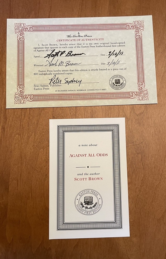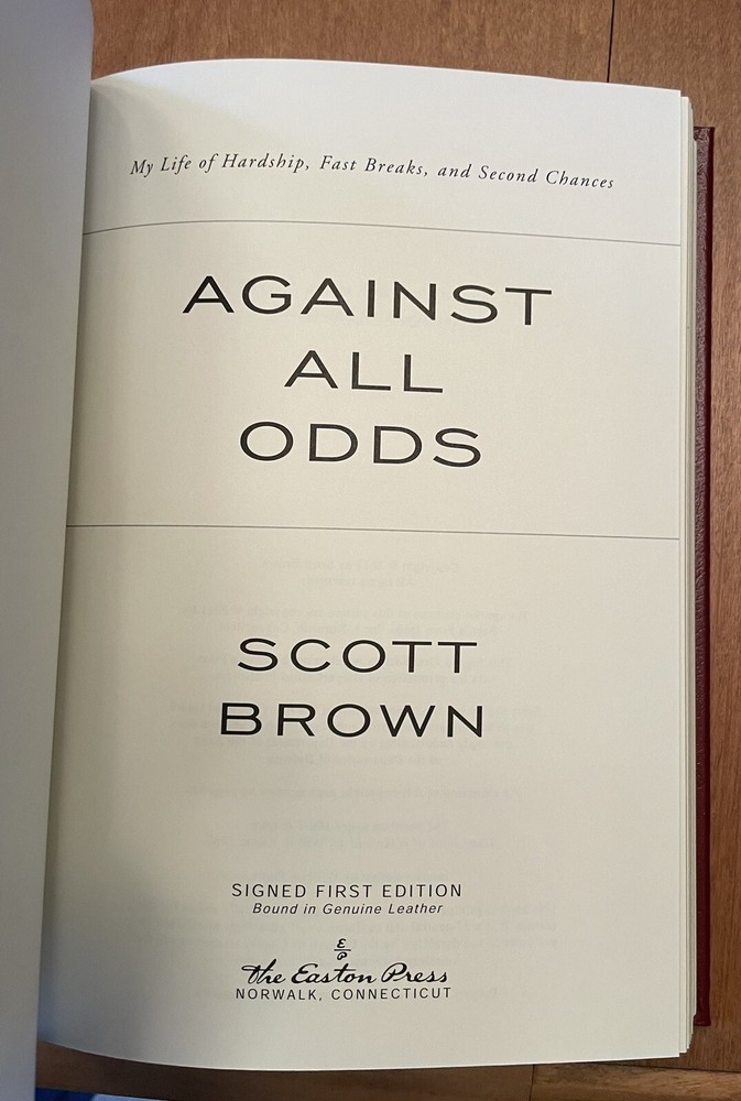 Against All Odds by Scott Brown, Easton Press, Signed First Edition, Leather Like New number 106 out of 800 Starting bidding well under original cost and current value, so grab a deal! Additional items ship for $1!