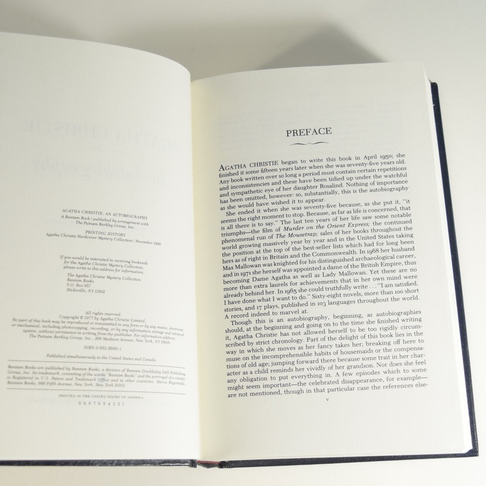Agatha Christie An Autobiography Bantam Leatherette Mystery Collection 1st Edition 1st Printing Hardcover 1990 Condition: Corner of 1st Page inside cover (flyleaf) is pasted down 1 inch onto front endpaper, (slight imperfection from printer). otherwise Clean unmarked pages, tight spine, appears unread, clean covers, NOT Ex-Library.