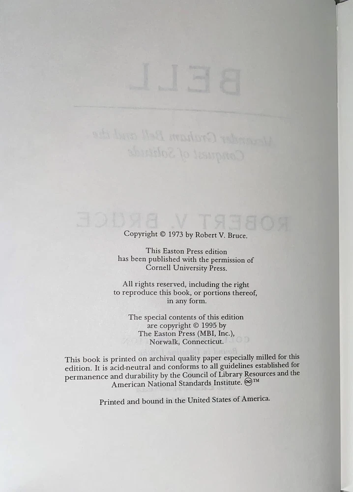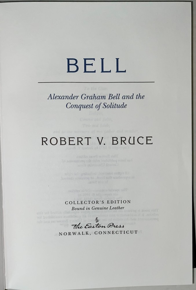 Alexander Graham Bell & the Conquest of Solitude by Robert V. Bruce, Easton 1995 Alexander Graham Bell & the Conquest of Solitude by Robert V. Bruce, Easton 1995 Alexander Graham Bell & the Conquest of Solitude by Robert V. Bruce Part of the American History collection of The Easton Press, Norwalk, Connecticut, 1995. This book is in excellent, unread condition, however, there is a tiny scratch on the gilded top page end. Includes Notes from History. The Easton Press books are bound in genuine leather binding, with 22kt gold accents and hubbed spines, gilded page ends, acid-neutral paper and evocative illustrations and decorations. Please see the details on the "Shipping and Payments" tab for information on sales tax. We will be happy to combine shipping, wherever possible. Some items cannot be combined because of their size, weight or because they are fragile. Please ask if you have any questions. Your order will ship by the next business day after receiving payment. PayPal only, please. All items are from a smoke-free environment. Thank you, and Happy Reading! Returns: Yes, we accept returns. Please refer to our Return and Refund Policy for details.