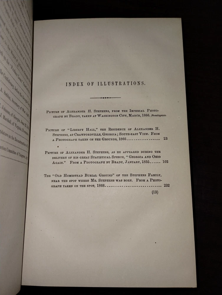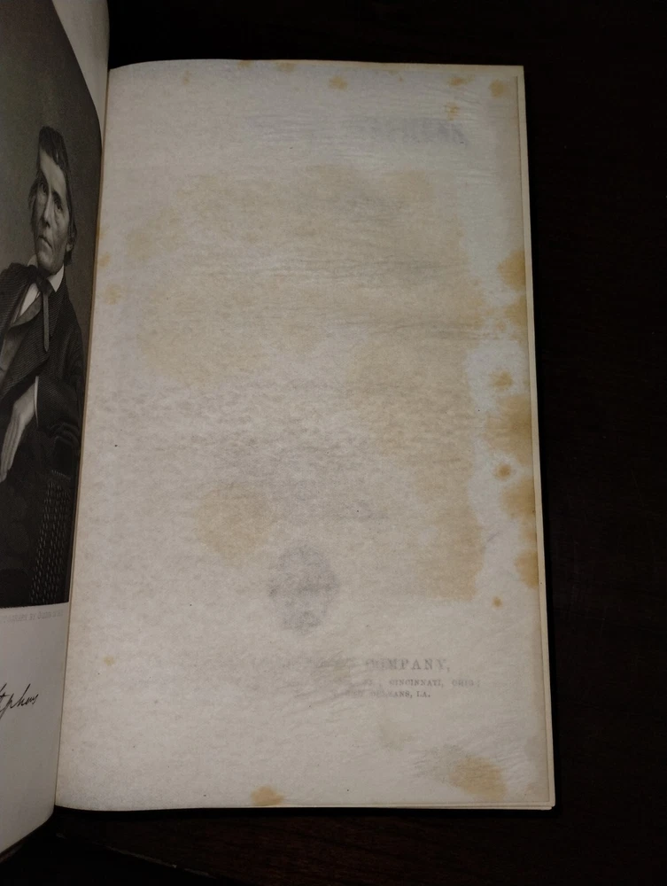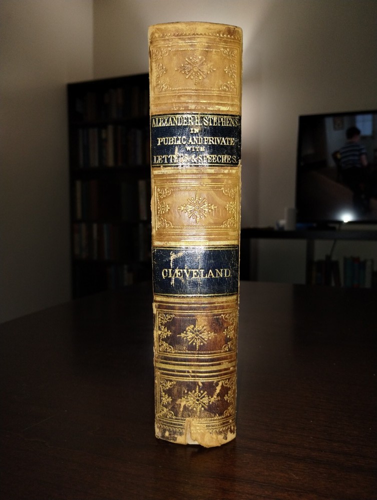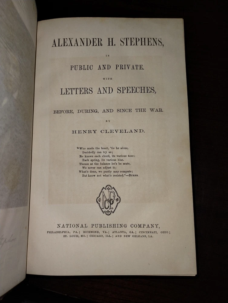 Philadelphia: National Publishing Company, 1866. First Edition. Hardcover. Good. Octavo. 833 pages, errata slip, [1]. Frontispiece engraved portrait of young Stephens moderately foxed. Tissue protected engravings also foxed. Moderate toning to the title page. Facsimile letters in text. 1/2 brown leather binding, with brownish marbled paper covered boards. Gilt decorations and leather title labels on the spine. Marbled end sheets. Tideline damage to rear end papers only. Marbled text edges. Light edge and shelf wear to the binding. Alexander H. Stephens was an American politician who served as the first and only vice president Confederate States from 1861 to 1865. Also serving as the 50th Governor of Georgia. Contained within this book is the famous "cornerstone speech." An improvised address delivered just weeks before the civil war began which defended slavery as fundamental and just on account of the supposed inferiority of the black race. Other points of contrasts were touched on between Union and Confederate ideologies, as well as the Confederates reason for seceding. An interesting, if not dark piece of American history particularly around the time of the Civil War. Ships via media mail. Inquire with questions. Please see photos. Notice: As of 7/7/25 we will be reducing the descriptive information for common and less valuable items. While we always aim to provide accurate and concise information about the book you are buying, the rate we are able to list vs the backlog of stock we have to offer has grown too great. It no longer makes sense for us to spend the same amount of time on a $10 as it does a $100 or even $1,000 book. As such, descriptions will be shortened to the bare bones on common items. This will be formatted as: Publisher, City of Publication, date of copyright. Number of pages, size. Condition: Book Condition/Dust jacket condition if applicable. Any major pertinent flaws I. E. a tear to the dust jacket, soiling, etc. Example: Garden City, New York, 1938. [IX], 8vo. Condition: G/G. Boards bowed, tear to the front joint of the jacket. We will always mention whether a book has writing within it beyond common marks such as a former price, stock number, owner name or initials, etc., OR major condition issues. Condition will be between Fine-Poor in line with The Antiquarian Booksellers Association of America(ABAA). Below you will find a helpful guide for determining the condition of a given book. Fine , ( abbreviated F ) Fine is very close to As New in condition, except that the book may have been been previously opened or carefully read. Very Good ( abbreviated VG ) This is a book that shows signs of prevoius ownership and use, but it?s still very nice copy. If there are any flaws or defects such as the former owner?s name ( FON ) or the former owner?s initials ( FOI ) , they need to be specifically noted. Good ( abbreviated G ) Possibly the most confusing book condition for the layman. A good condtion book will show significant wear including the potential for tears in the dust jacket, wear on the edges of the wraps or boards as well as the textblock. Specific issues should still be noted. A good condition book should still have all pages and a fully intact cover. Fair is a book with noticable wear. Some non-essential pages such as the Front Free End Paper(FFEP) or Rear Free End Paper (RFEP) may possilby be missing but the entire text and all plates should be still present. A Fair condition book isn?t typically considered collectible condition (except in cases where scarcity is such a factor that a better copy isn?t commonly avaialble). Fair condition books are still servicable reading copies. Poor A book with significant wear and faults. A poor condition book is still a reading copy with the full text still readable. Any missing pages must be specifically noted. Ex Library : In traditional book description guidelines, this is a book condition unto itself. The statement that the book was removed from library circulation historically indicated that the book had no collectible value due to certain standard practices of libraries such as ink stamps asserting ownership and uniquely durable tape binding the dust jacket to the rest of the book. That old standard has relaxed some over the years. An additional condition report may be requested by the buyer BEFORE purchase.