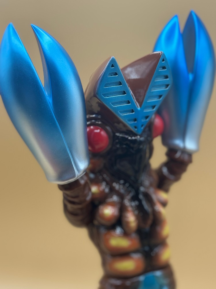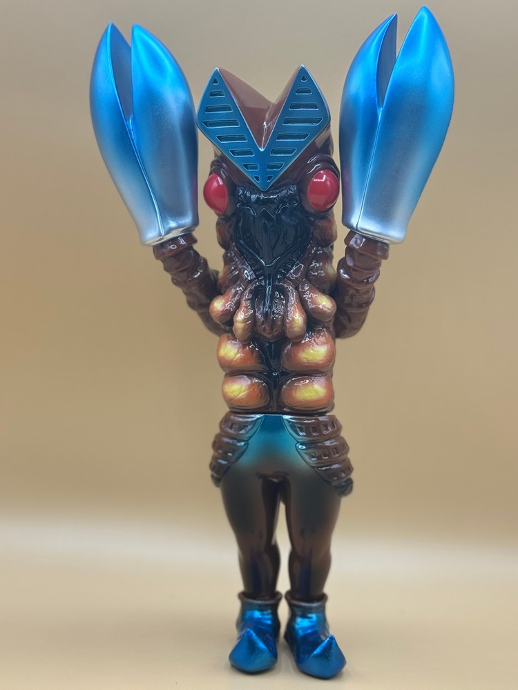 This Alien Baltan figure from Planet-X Asia is an absolute must-have for Ultraman fans! The sculpt captures the menacing charm of Ultraman's iconic foe, and the exclusive colorway makes it pop. At nearly 10 inches tall, it’s an impressive display piece, especially with Matt Frank’s stunning header art. The quality and detail are top-notch, making it a standout in any kaiju collection. Highly recommended for sofubi enthusiasts!