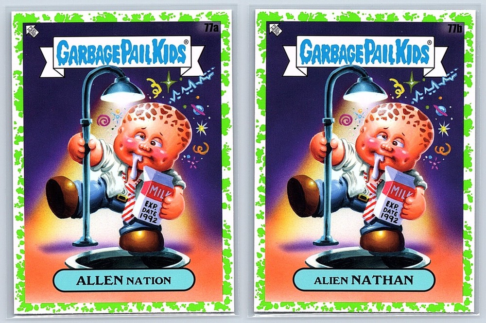 2023 Topps Garbage Pail Kids Series 2 - Intergoolactic Mayhem 2 Card Set - Includes BOTH cards pictured: Allen Nation 77a & Alien Nathan 77b! Perfect for Christmas & Birthday Gifts, Gags and Fun! Check out our Seller Page for more GPK Cards! Images are representative of cards received. These cards are Pack FRESH and in Near Mint (centering and condition) or Better! Shipping Information ***Will ship FAST (I drop off orders at USPS daily before last pickup except Weekends) Item will ship properly in a TOP LOADER/Sleeve with TRACKING! I have years of experience shipping thousands of cards successfully all over the world. ***In order for us to provide affordable GPK Global option, International Shipping will ship via USPS International Basic Mail and may not have tracking depending on value of order.*** Combined Shipping discounts for International!! Affordable rates / Safest Delivery! See reviews **I am not responsible for any custom fees/Import taxes etc. Please contact your local country contacts for any additional Import fees. ***Please FOLLOW our GPK Seller EBAY STORE for exclusive Deals and Promotions.***