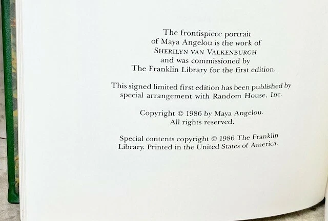 All God's Children Need Traveling Shoes SIGNED by Maya Angelou Franklin Library Condition and Terms This book is in excellent, unused or very gently-used condition. There are no attached bookplates or embossed seals. Sharp corners, no obvious scuffs or rubs. There are little to no scratches/marks to the gilded page-edging (see photos). Please see the photographs for best description. Please review all photos carefully before purchasing, and feel free to ask questions if the photos do not suffice. We can also provide additional photos upon request. Returns are only allowed due to shipping damage or item not being as described. Due to USPS insurance claims procedures, partial refunds are not allowed due to shipping damage. Items damaged in shipping must be returned in the original packaging as received. The USPS requires inspection of the packaging and item damaged. Synopsis Once again, the poet casts her spell as she resumes one of the greatest personal narratives of our time. In this continuation, Angelou relates how she joins a "colony" of Black American expatriates in Ghana--only to discover no one ever goes home again.