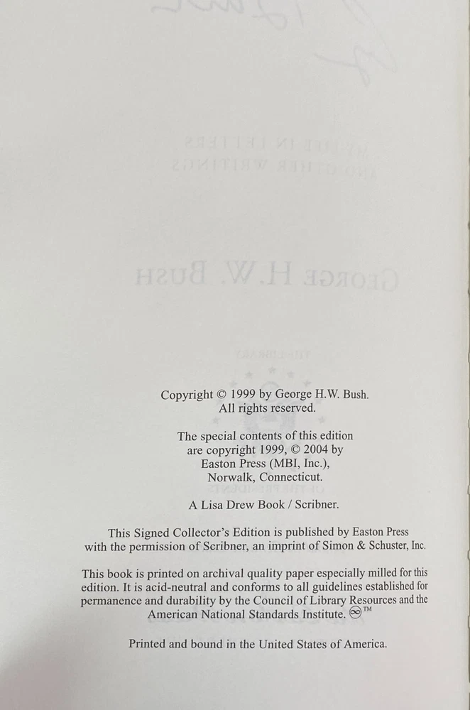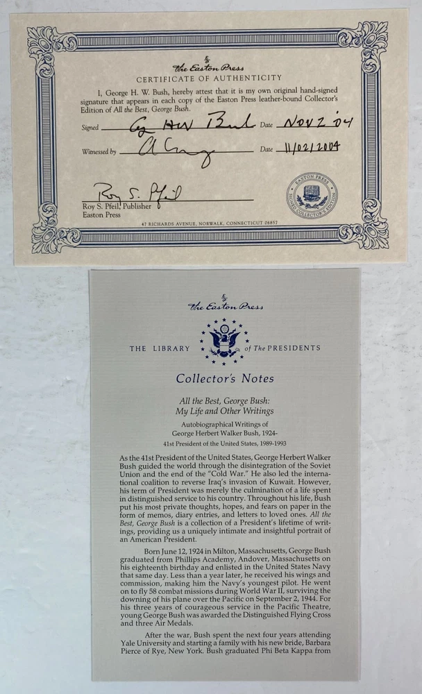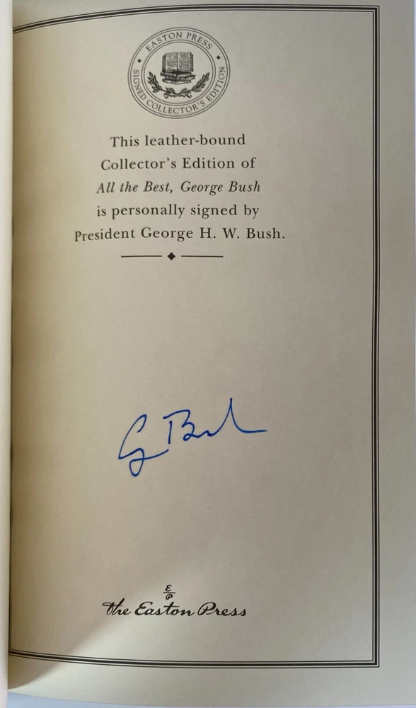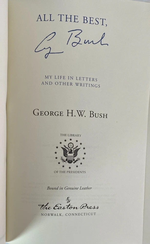 All the Best by George H. W. Bush, Easton Press, 2004 Signed with Certificate of Authenticity. Includes Collector's Notes. Part of the Library of the Presidents collection of The Easton Press, Norwalk, Connecticut, 2004. This book is in very good, unread condition. There is however, some scratches at the top and bottom edges of the covers. The Easton Press books are bound in genuine leather binding, with 22kt gold accents and hubbed spines, gilded page ends, acid-neutral paper, and evocative illustrations and decorations. We will be happy to combine shipping, wherever possible. Some items cannot be combined because of their size, weight or because they are fragile. Please ask if you have any questions. Your order will ship by the next business day after receiving payment. All items are from a smoke-free environment. Thank you, and Happy Reading!