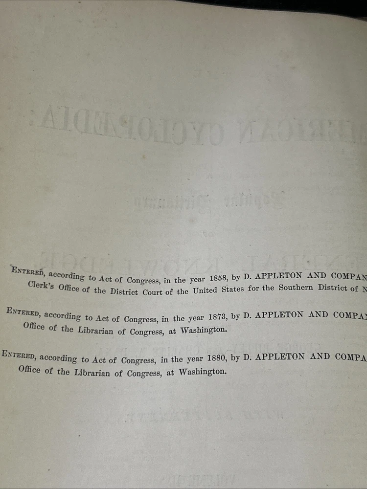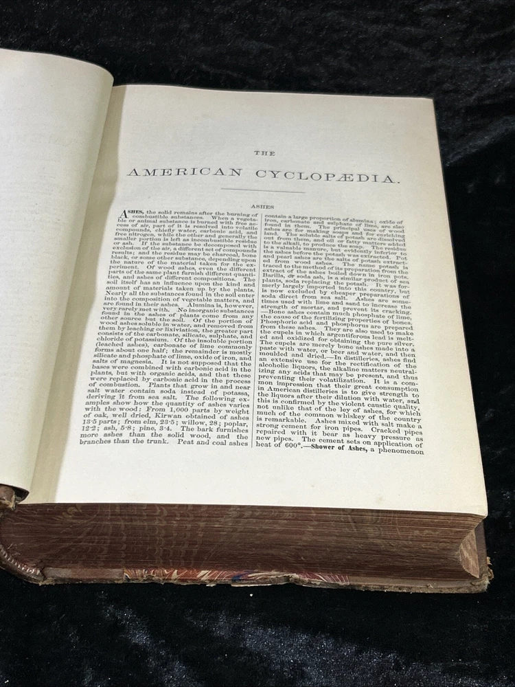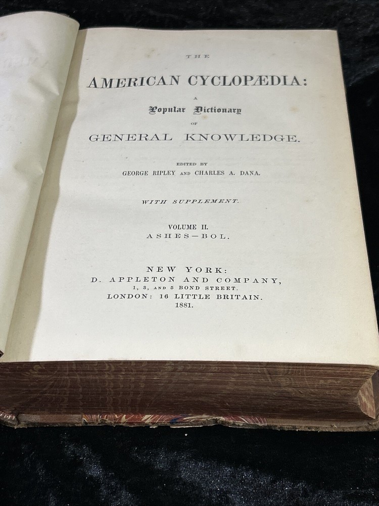 This is a luxury edition, collector's edition of "The American Cyclopaedia, A popular Dictionary of General Knowledge Volume II " published by D. Appleton & Company in New York in 1881. It is a leather-bound, illustrated first edition historical book in English. Volume II - Ashes - bol As of this listing date, we have several volumes of this dictionary available, but not a complete set. If you are interested in more than one copy, we offer BUY 3 GET 1 FREE and we are always happy to consider volume discounts. Please contact us for more pricing information.