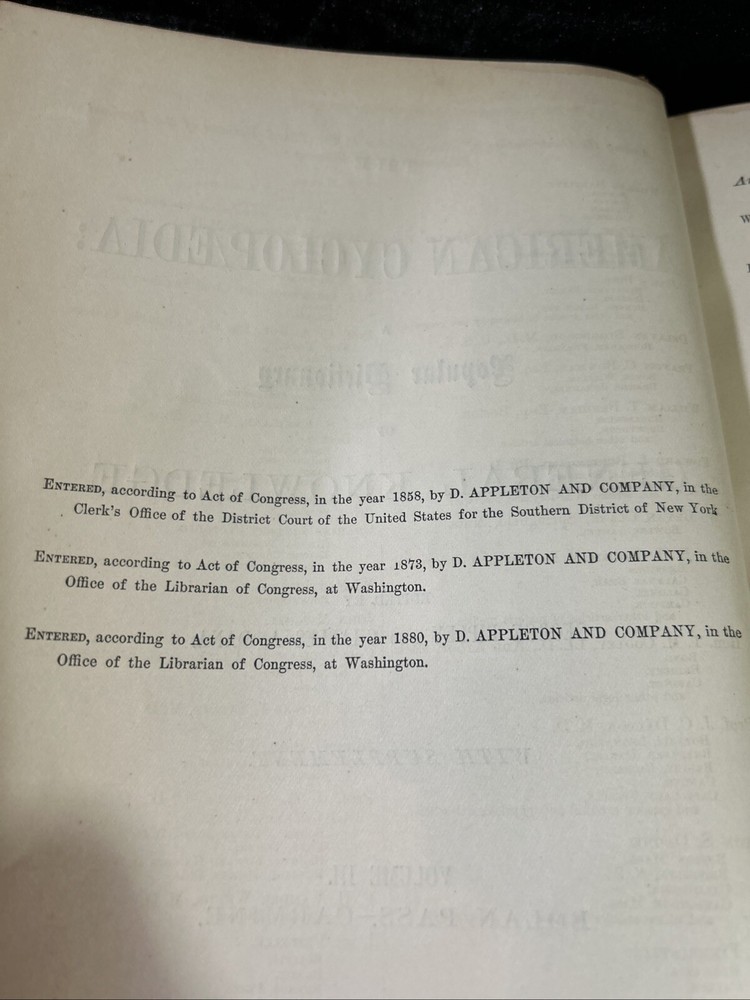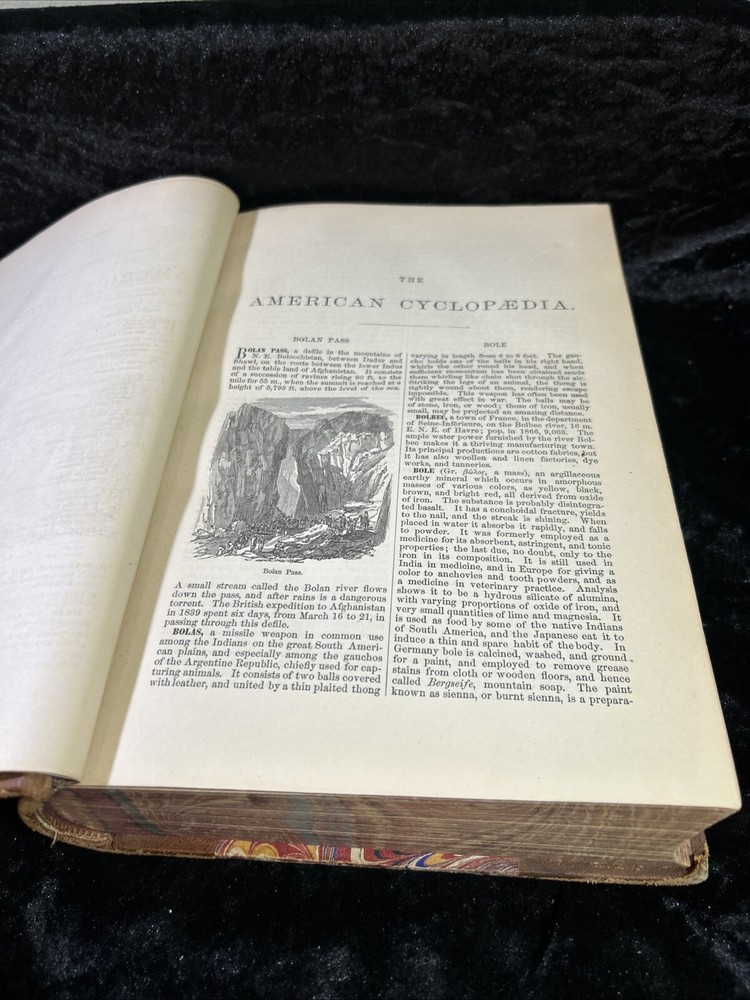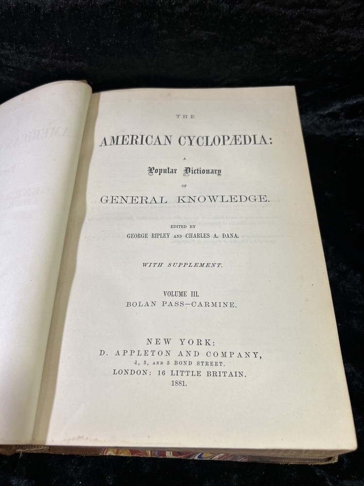 This is a luxury edition, collector's edition of "The American Cyclopaedia, A popular Dictionary of General Knowledge Volume III " published by D. Appleton & Company in New York in 1881. It is a leather-bound, illustrated first edition historical book in English. Volume III - Bolan Pass - Carmine As of this listing date, we have several volumes of this dictionary available, but not a complete set. If you are interested in more than one copy, we offer BUY 3 GET 1 FREE and we are always happy to consider volume discounts. Please contact us for more pricing information.