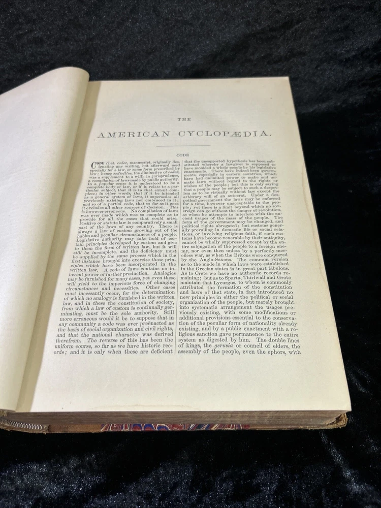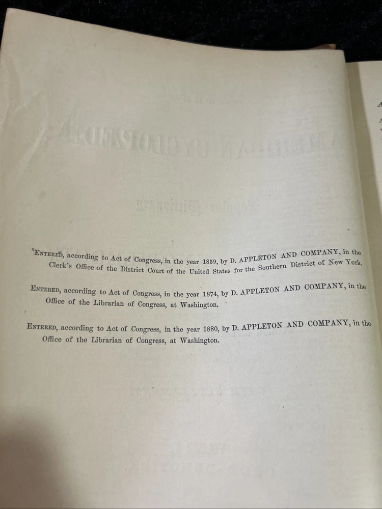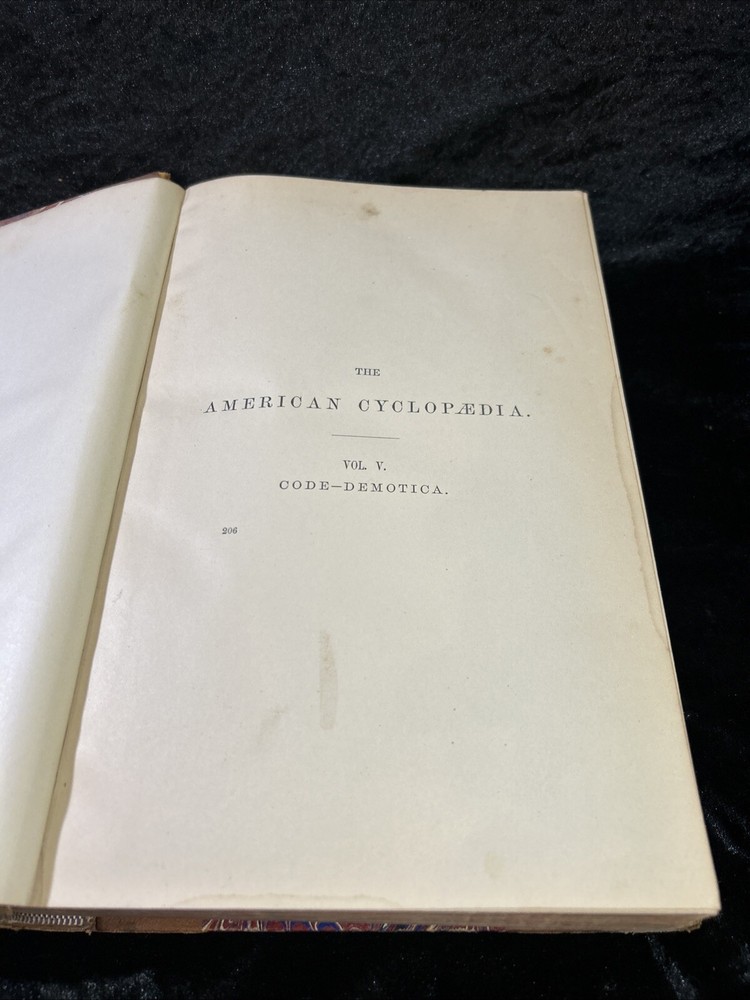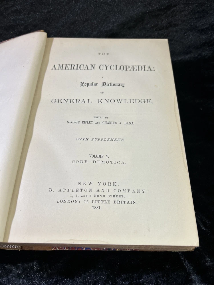 This is a luxury edition, collector's edition of "The American Cyclopaedia, A popular Dictionary of General Knowledge Volume V " published by D. Appleton & Company in New York in 1881. It is a leather-bound, illustrated first edition historical book in English. Volume VX- Code - Demotica As of this listing date, we have several volumes of this dictionary available, but not a complete set. If you are interested in more than one copy, we offer BUY 3 GET 1 FREE and we are always happy to consider volume discounts. Please contact us for more pricing information.