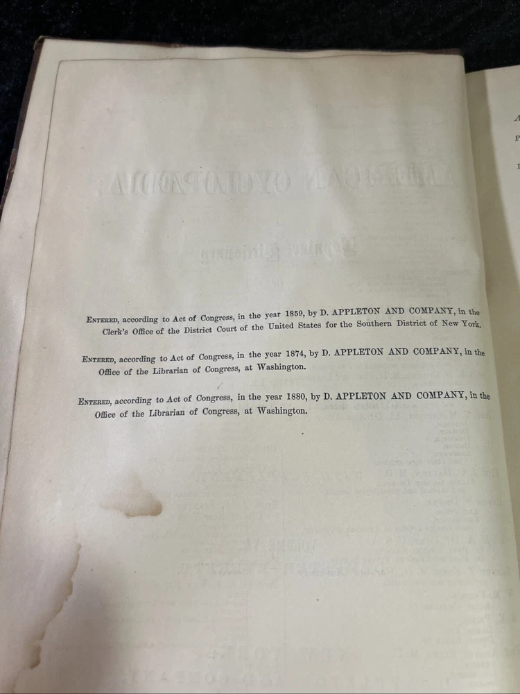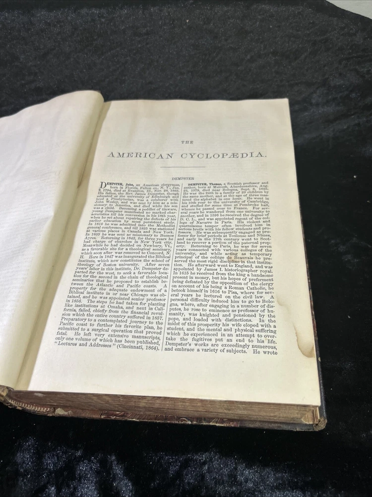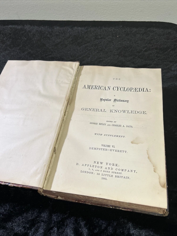 This is a luxury edition, collector's edition of "The American Cyclopaedia, A popular Dictionary of General Knowledge Volume VI " published by D. Appleton & Company in New York in 1881. It is a leather-bound, illustrated first edition historical book in English. Volume VI - Dempster - Everett As of this listing date, we have several volumes of this dictionary available, but not a complete set. If you are interested in more than one copy, we offer BUY 3 GET 1 FREE and we are always happy to consider volume discounts. Please contact us for more pricing information.