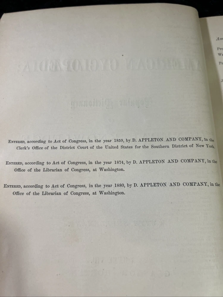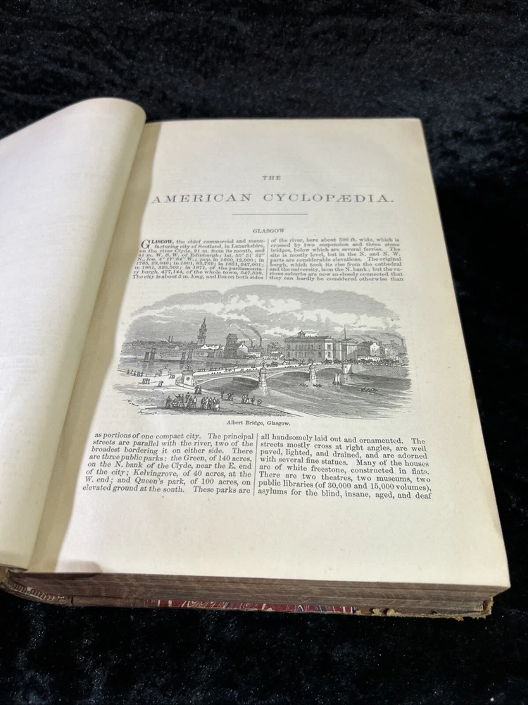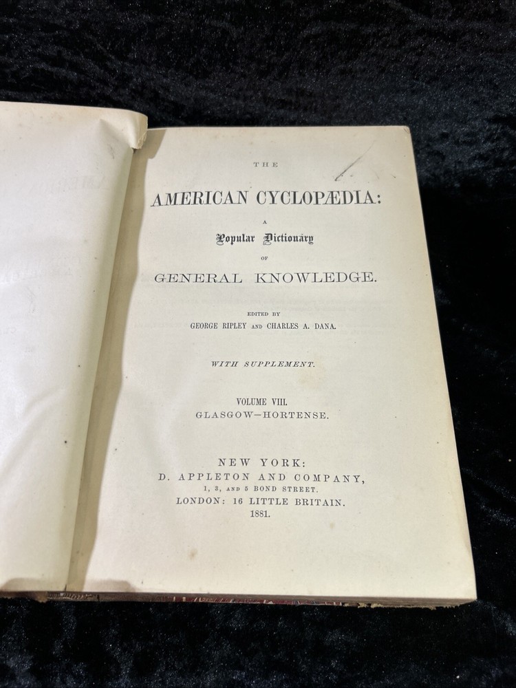 This is a luxury edition, collector's edition of "The American Cyclopaedia, A popular Dictionary of General Knowledge Volume VIII " published by D. Appleton & Company in New York in 1881. It is a leather-bound, illustrated first edition historical book in English. Volume VII - GLASGOW - Hortense As of this listing date, we have several volumes of this dictionary available, but not a complete set. If you are interested in more than one copy, we offer BUY 3 GET 1 FREE and we are always happy to consider volume discounts. Please contact us for more pricing information.