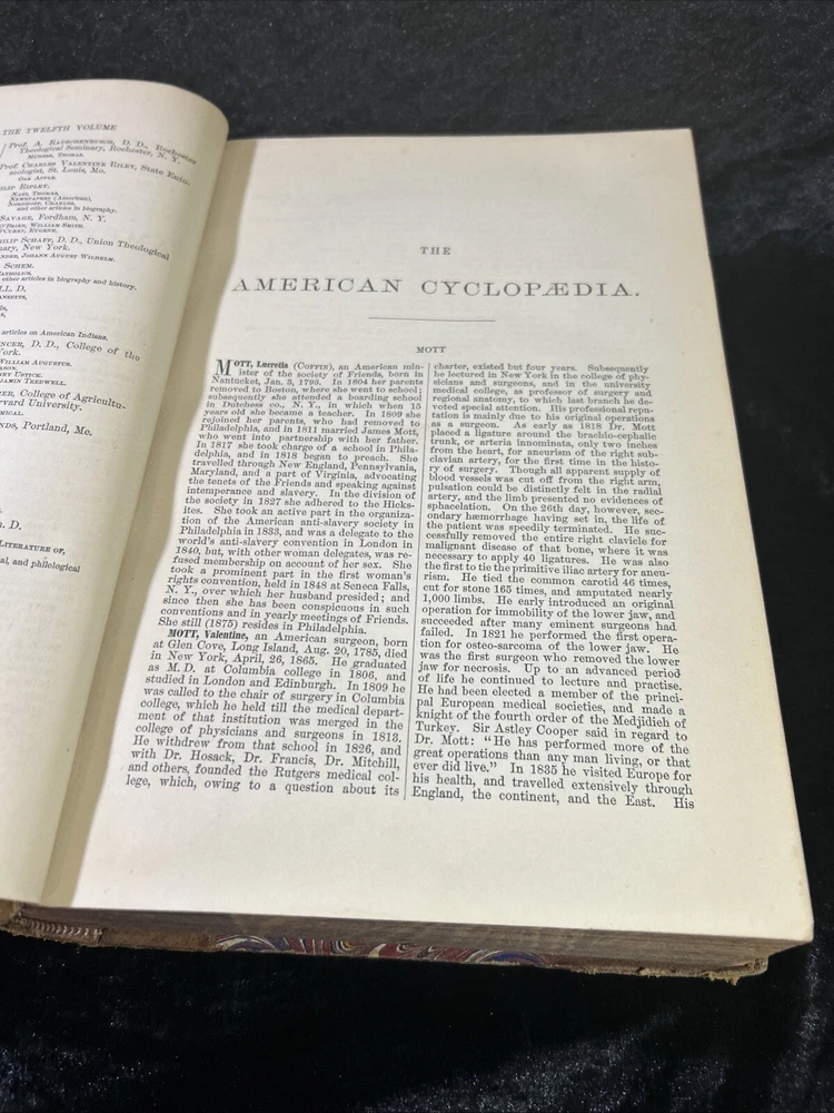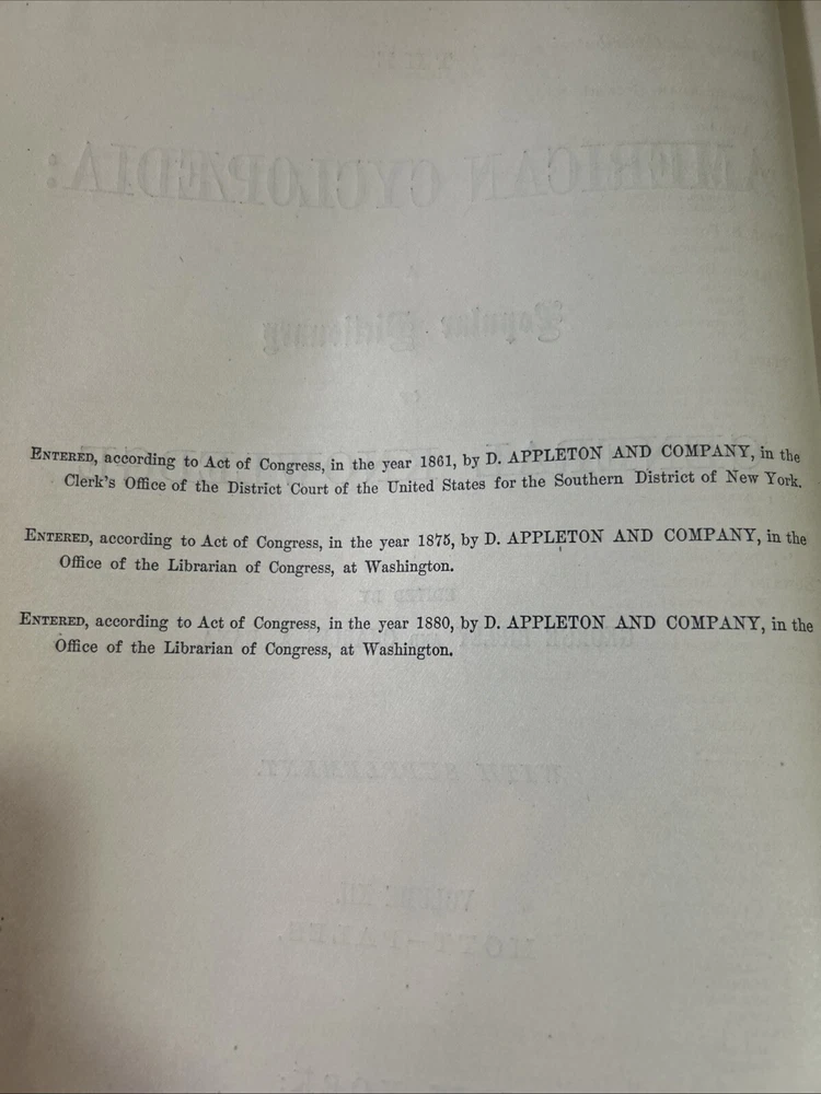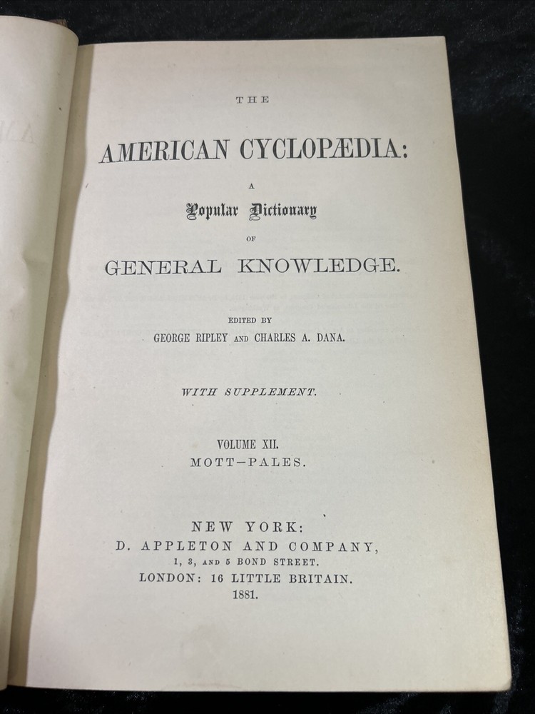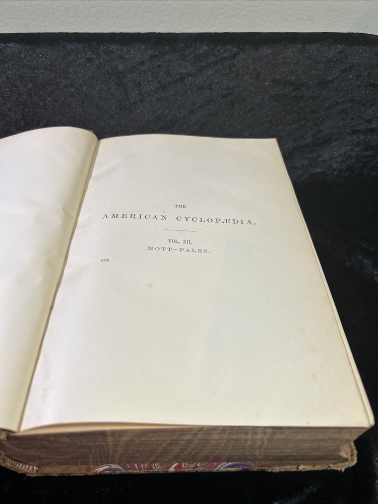 This is a luxury edition, collector's edition of "The American Cyclopaedia, A popular Dictionary of General Knowledge Volume XII " published by D. Appleton & Company in New York in 1881. It is a leather-bound, illustrated first edition historical book in English. Volume XII - Mott - Pales As of this listing date, we have several volumes of this dictionary available, but not a complete set. If you are interested in more than one copy, we offer BUY 3 GET 1 FREE and we are always happy to consider volume discounts. Please contact us for more pricing information.