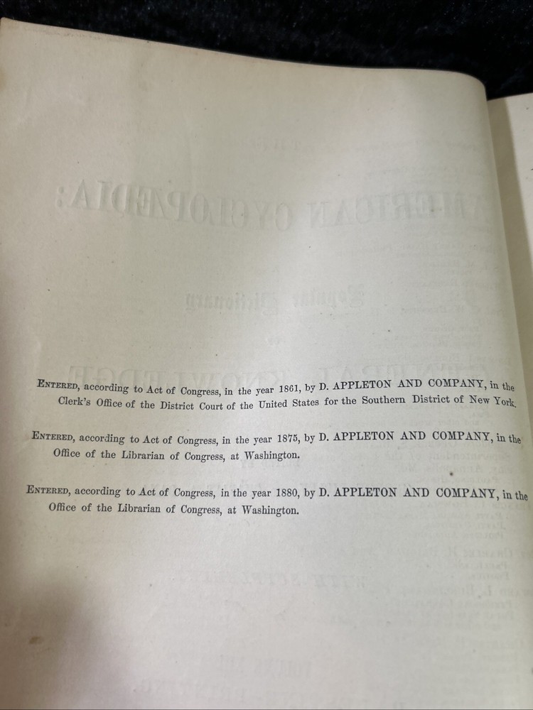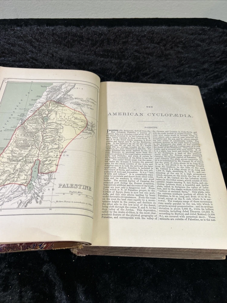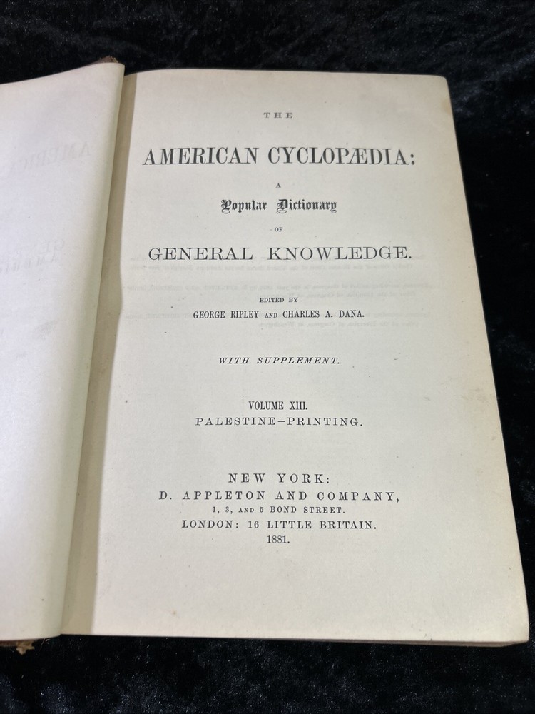 This is a luxury edition, collector's edition of "The American Cyclopaedia, A popular Dictionary of General Knowledge Volume XIII " published by D. Appleton & Company in New York in 1881. It is a leather-bound, illustrated first edition historical book in English. Volume XIII - Palestine - Printing As of this listing date, we have several volumes of this dictionary available, but not a complete set. If you are interested in more than one copy, we offer BUY 3 GET 1 FREE and we are always happy to consider volume discounts. Please contact us for more pricing information.
