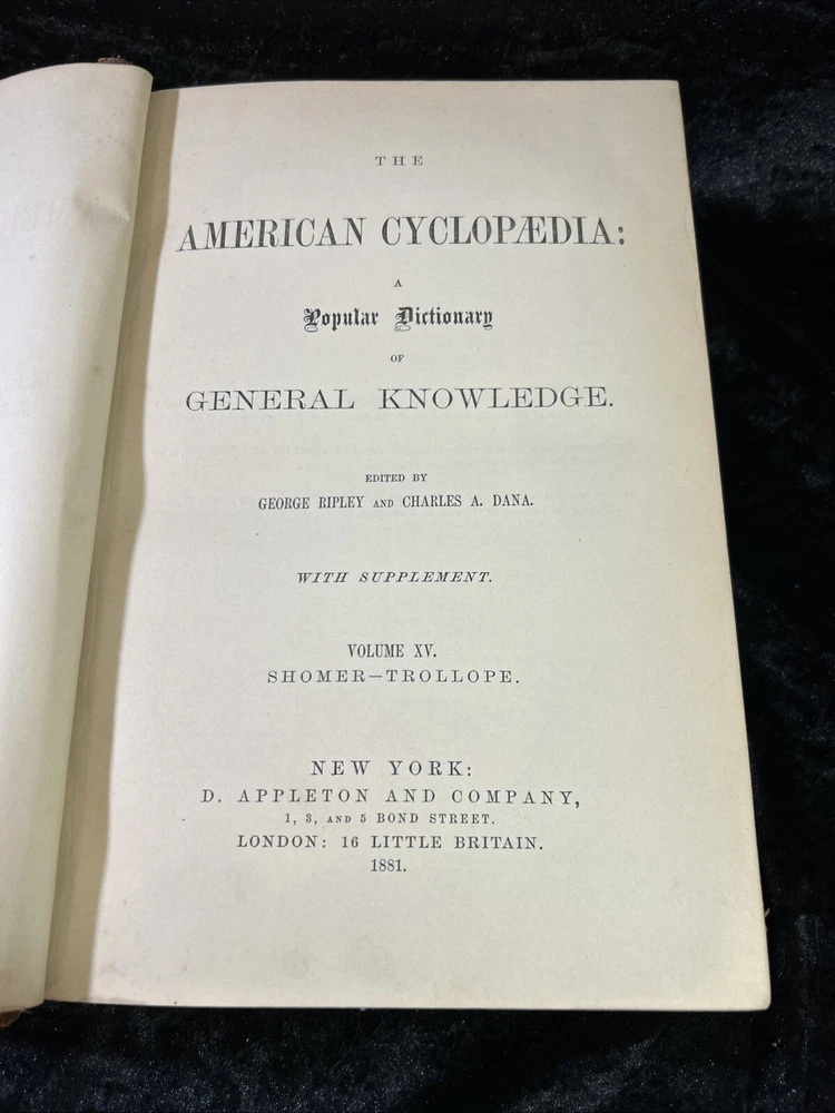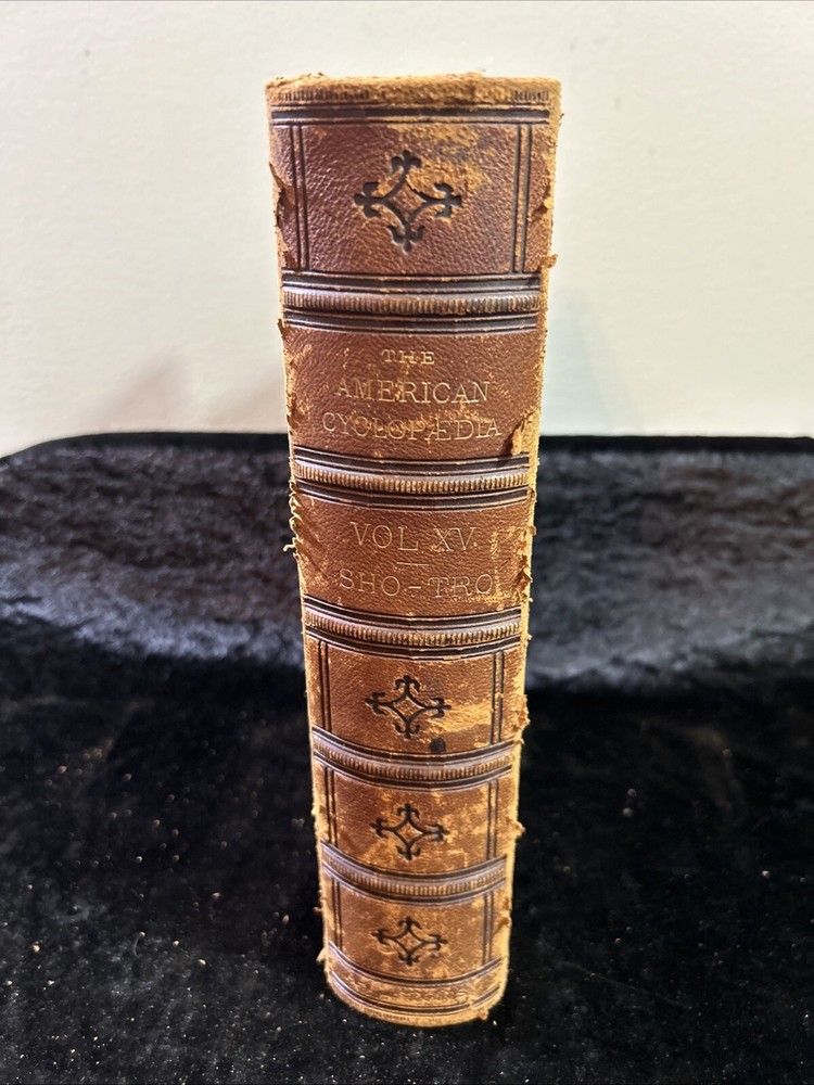 This is a luxury edition, collector's edition of "The American Cyclopaedia, A popular Dictionary of General Knowledge Volume XV " published by D. Appleton & Company in New York in 1881. It is a leather-bound, illustrated first edition historical book in English. Volume XV - Shomer - Trollope As of this listing date, we have several volumes of this dictionary available, but not a complete set. If you are interested in more than one copy, we offer BUY 3 GET 1 FREE and we are always happy to consider volume discounts. Please contact us for more pricing information.