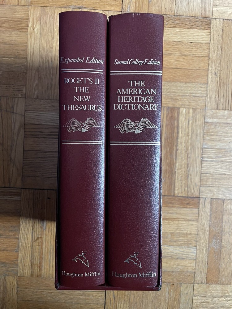 Set of American Heritage Dictionary & New Roget’s Thesaurus, 1988. Leather-bound set in fine condition, with scuffing on bottom of tray-case (see pictures)