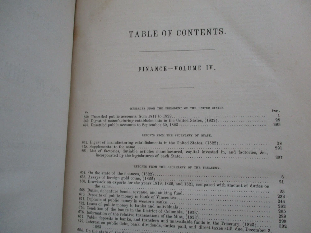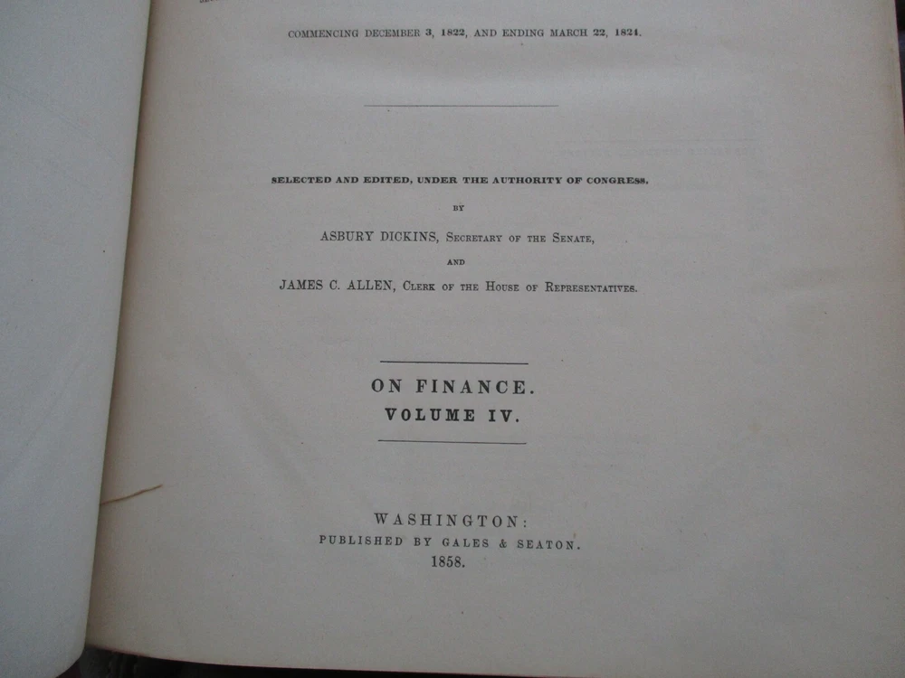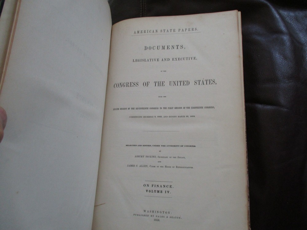 Available is this large and heavy partial leather hardcover titled "American State Papers - Documents Legislative and Executive of the Congress of the United States on Finance Volume IV" published in 1858. Financial data and many interviews with government department heads. Thank you for looking. All items will be packaged carefully for protection from moisture and rough handling.