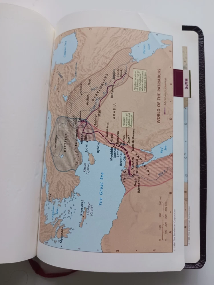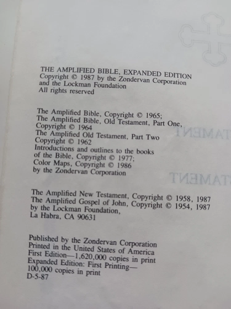 1987 Zondervan Amplified Bible. Expanded Edition. Tabed & Guilded Pages. Red Bonded Leather. Has signs of use, writing and such. Some tabs are loose but can be taped. The print is rich and dark. A very nice bible with refferances and word meanings.